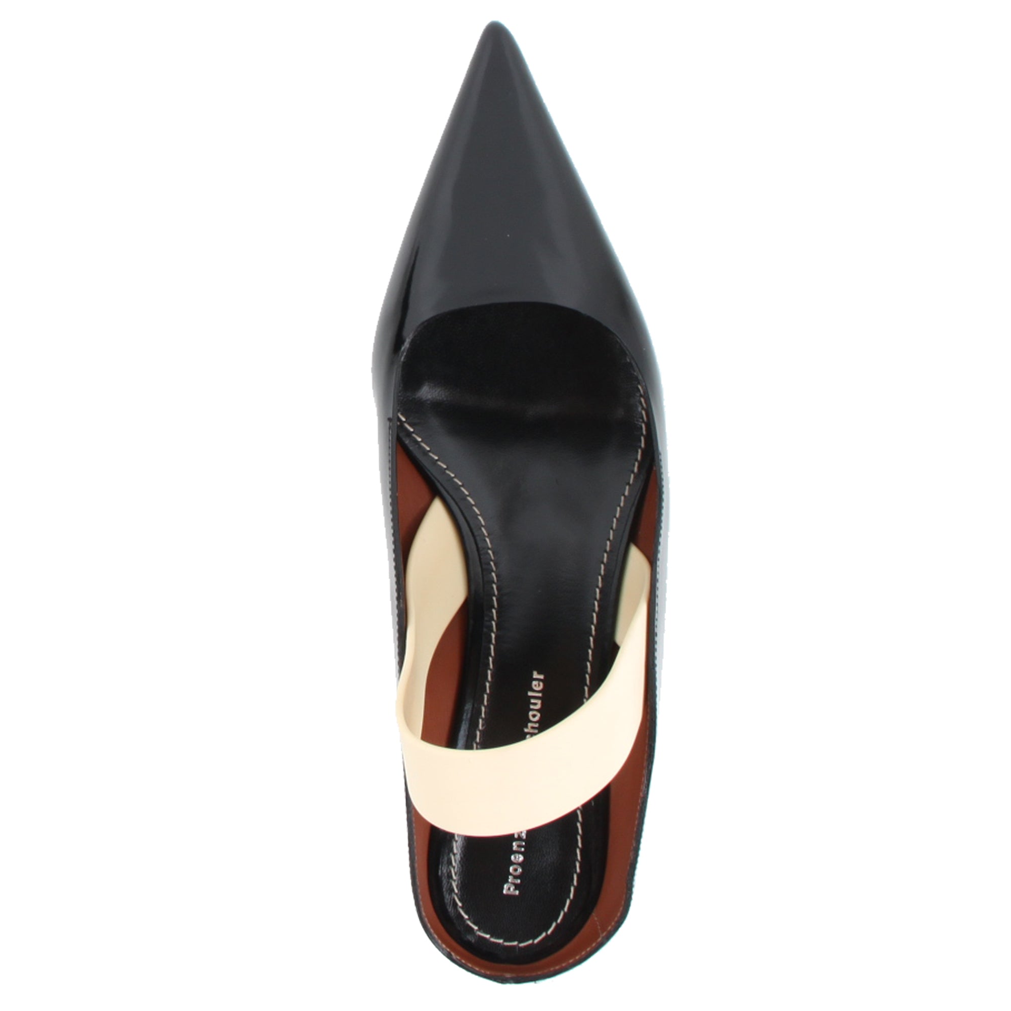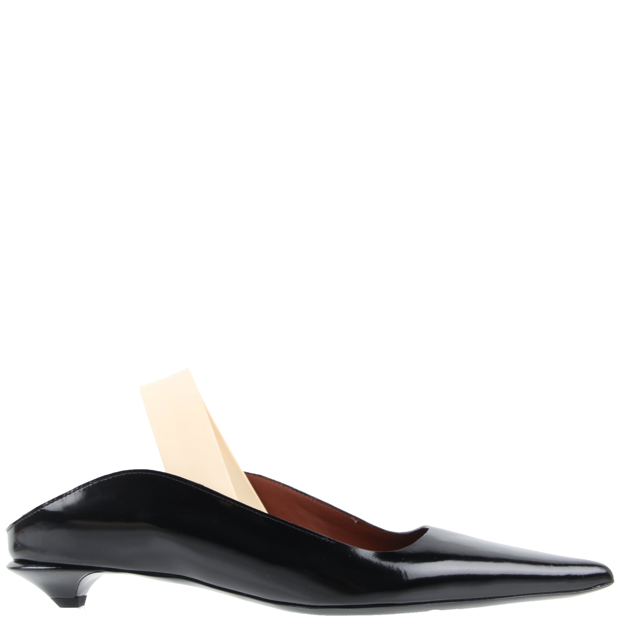 The Slingback Wave Pumps reimagine the classic pump silhouette with a gestural wave design and an angular kitten heel. They are crafted in smooth polished black leather and secured with a rubberized slingback.