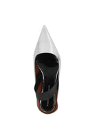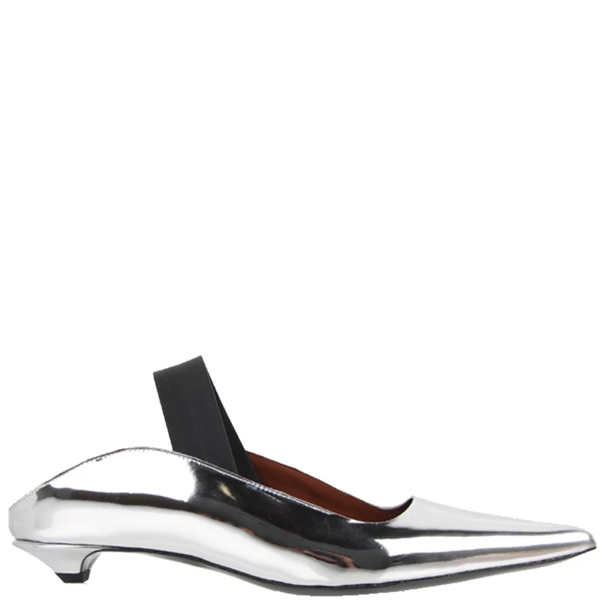 The Slingback Wave Pumps reimagine the classic pump silhouette with a gestural wave design and an angular kitten heel. They are crafted in smooth patent silver leather and secured with a rubberized slingback.