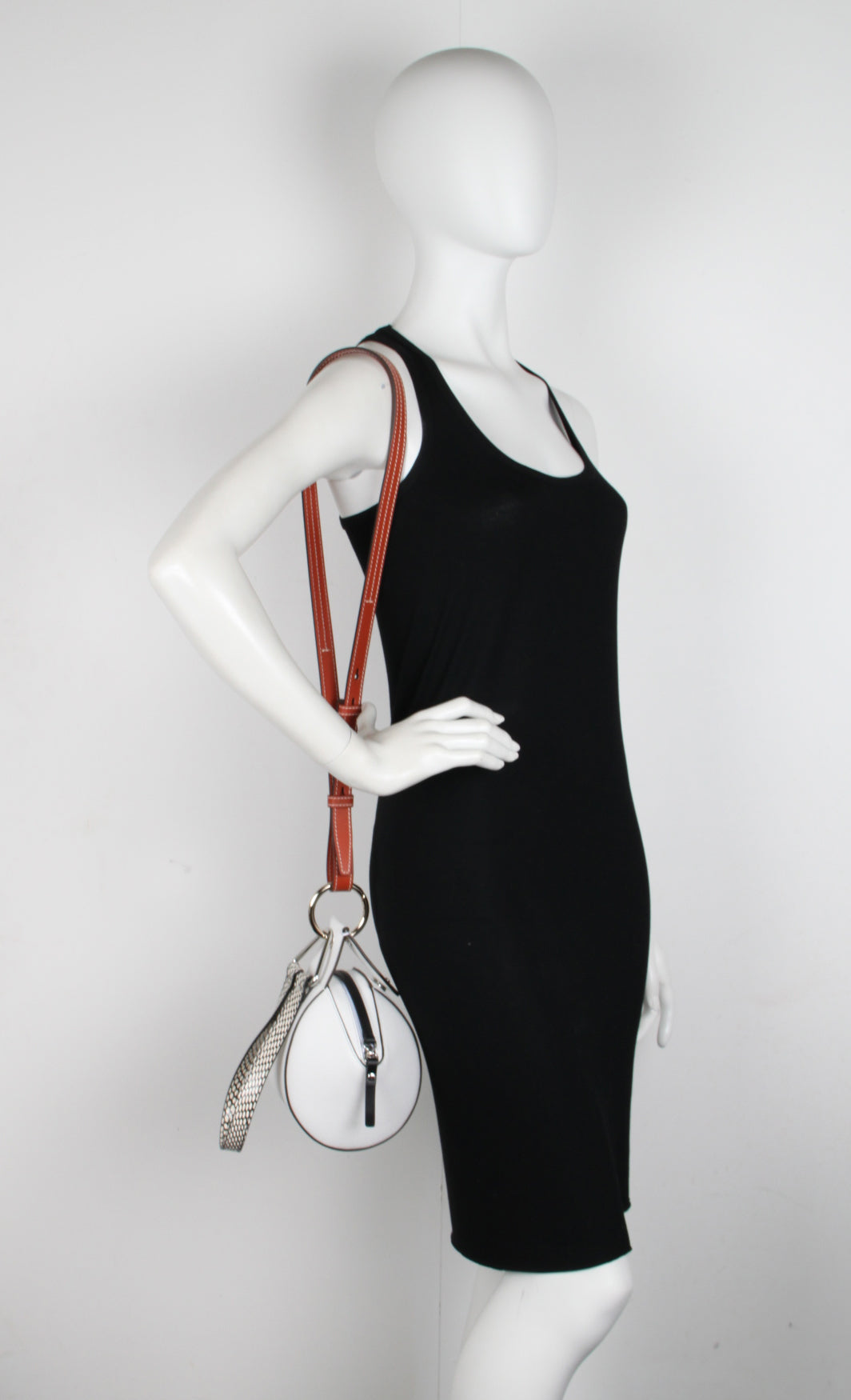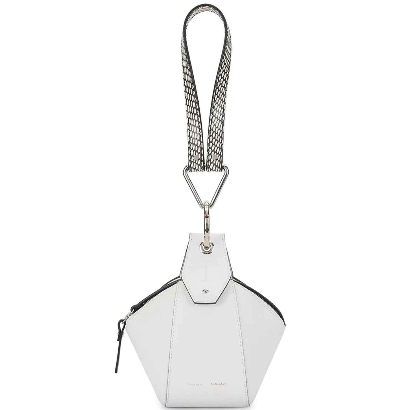 The Zipper Pochette in white combines grained calf leather with a graphic, structured silhouette and mixed metal hardware. Designed with a removable top handle in snakeskin-embossed calf leather and a contrasting adjustable shoulder strap with topstitching details. Magnetic fastening and top zip closure. Contrast black painted edges. Signature dual-toned logo stamp in silver and gold tones. Calf leather.