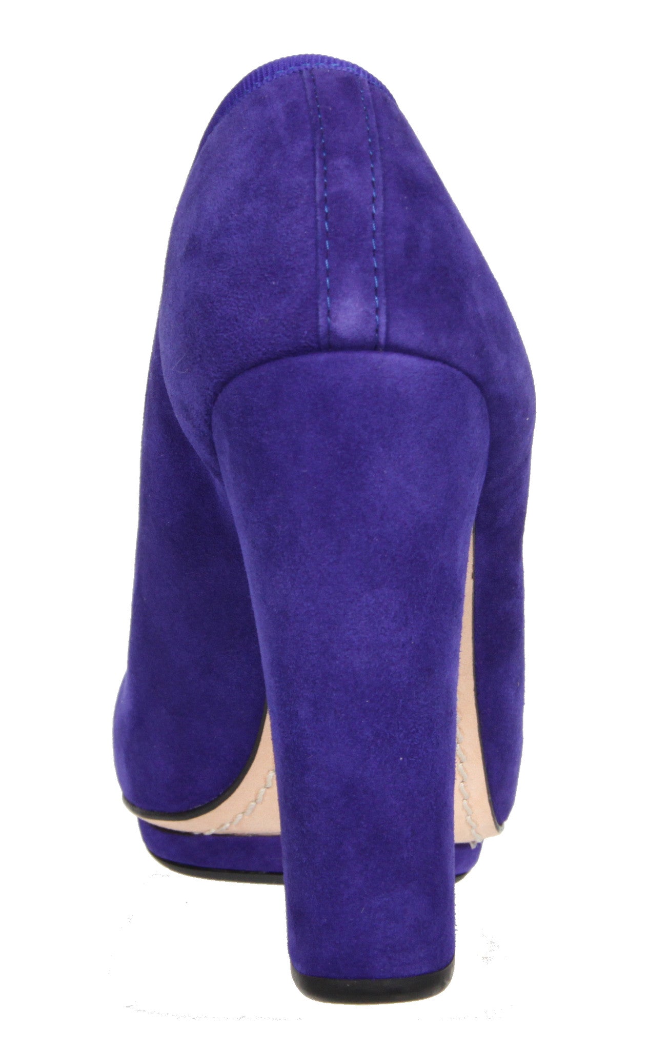 Platform Peep-Toe heel with suede upper. Cushioned foot bed. Open toe with grosgrain trim and bow detail. Rubber grips at base.