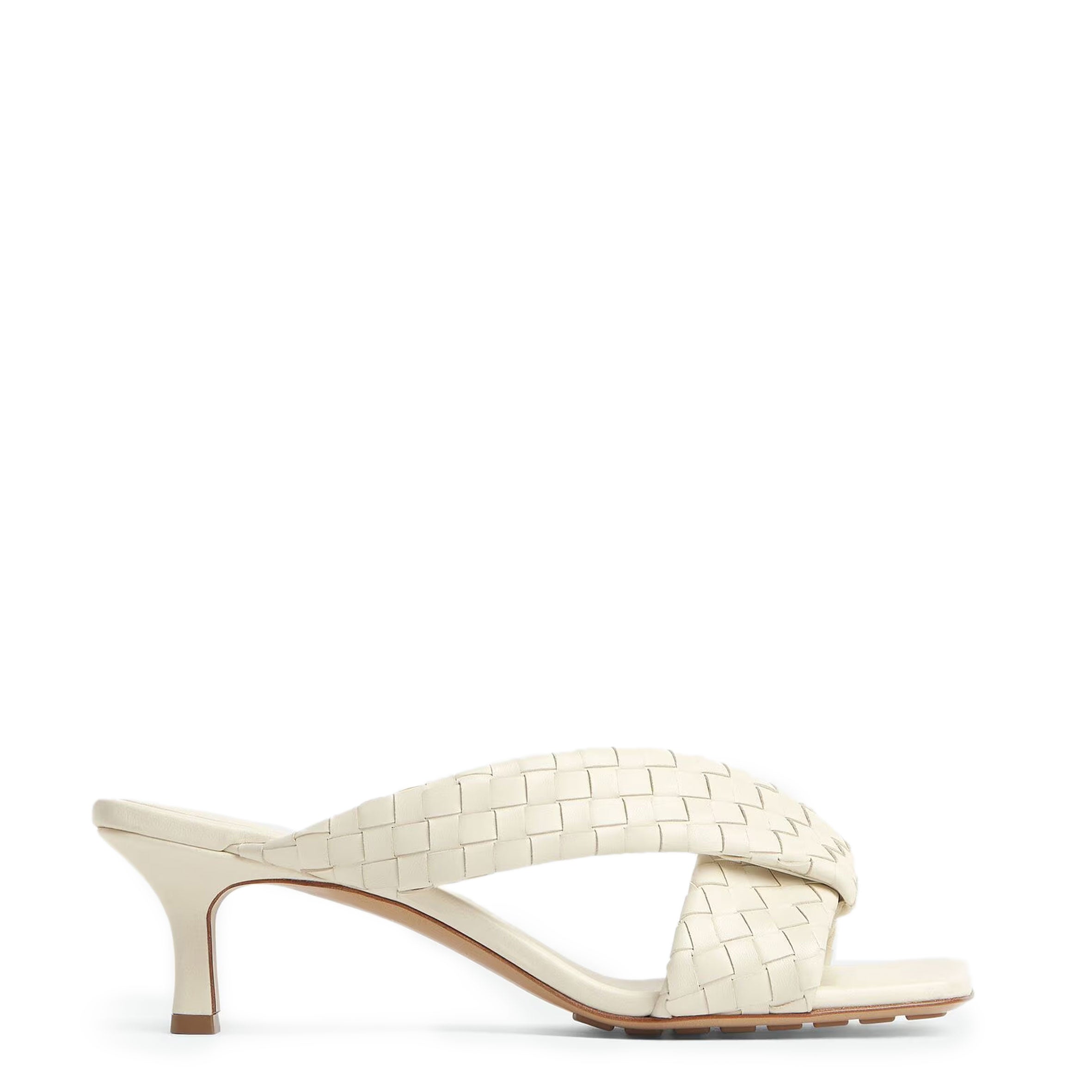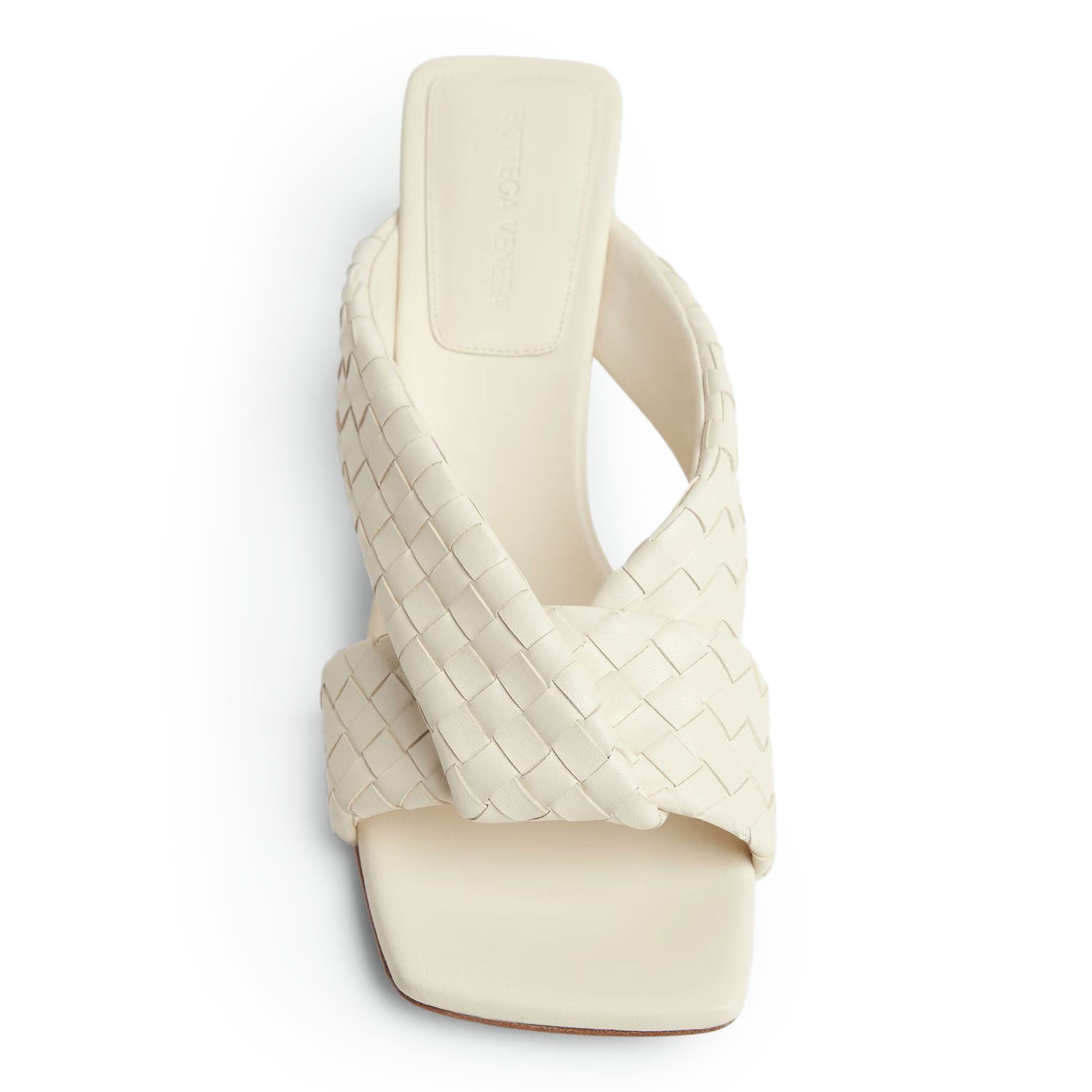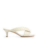 Kitten heel mule sandal in woven lambskin with padded tubular straps and twisted design.