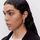 The Roppongi Drop earring with two large octagon-shaped, step-cut white zirconia in a warped prong setting. It is skillfully crafted in recycled sterling silver and features articulated links create movement when worn.