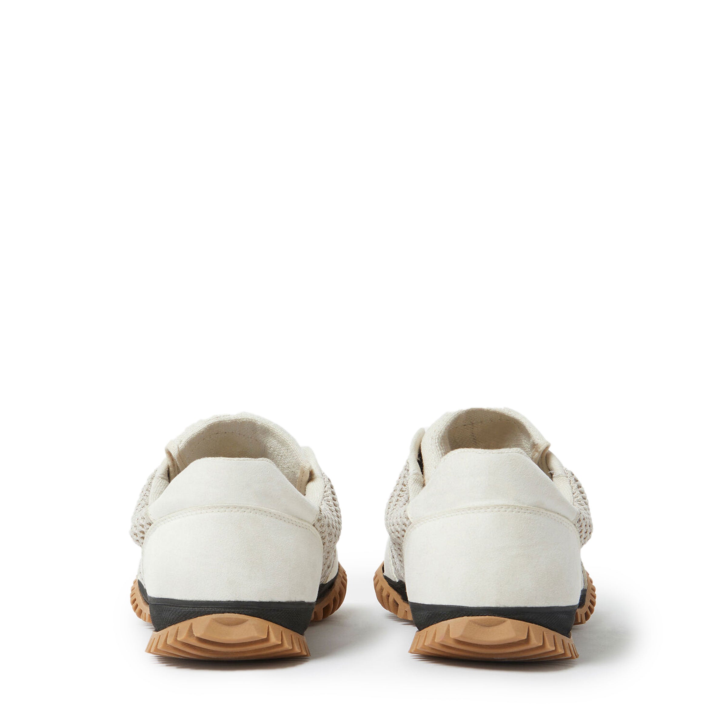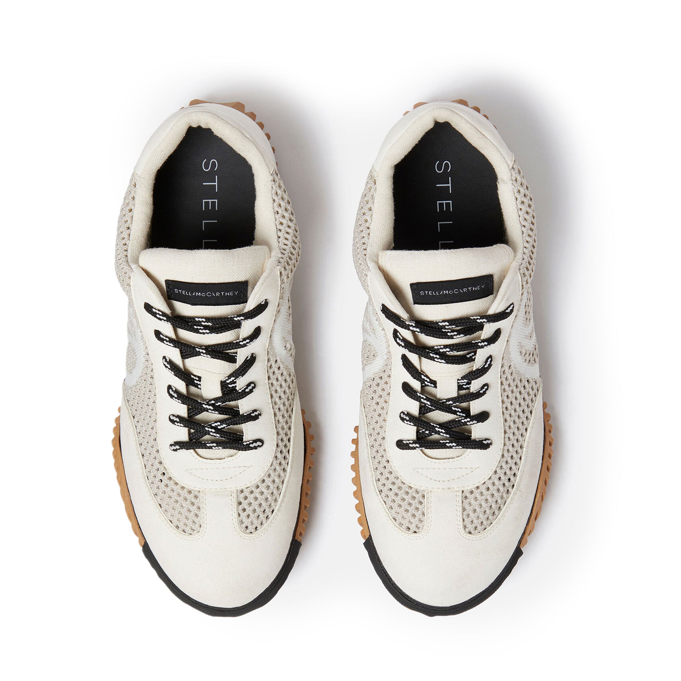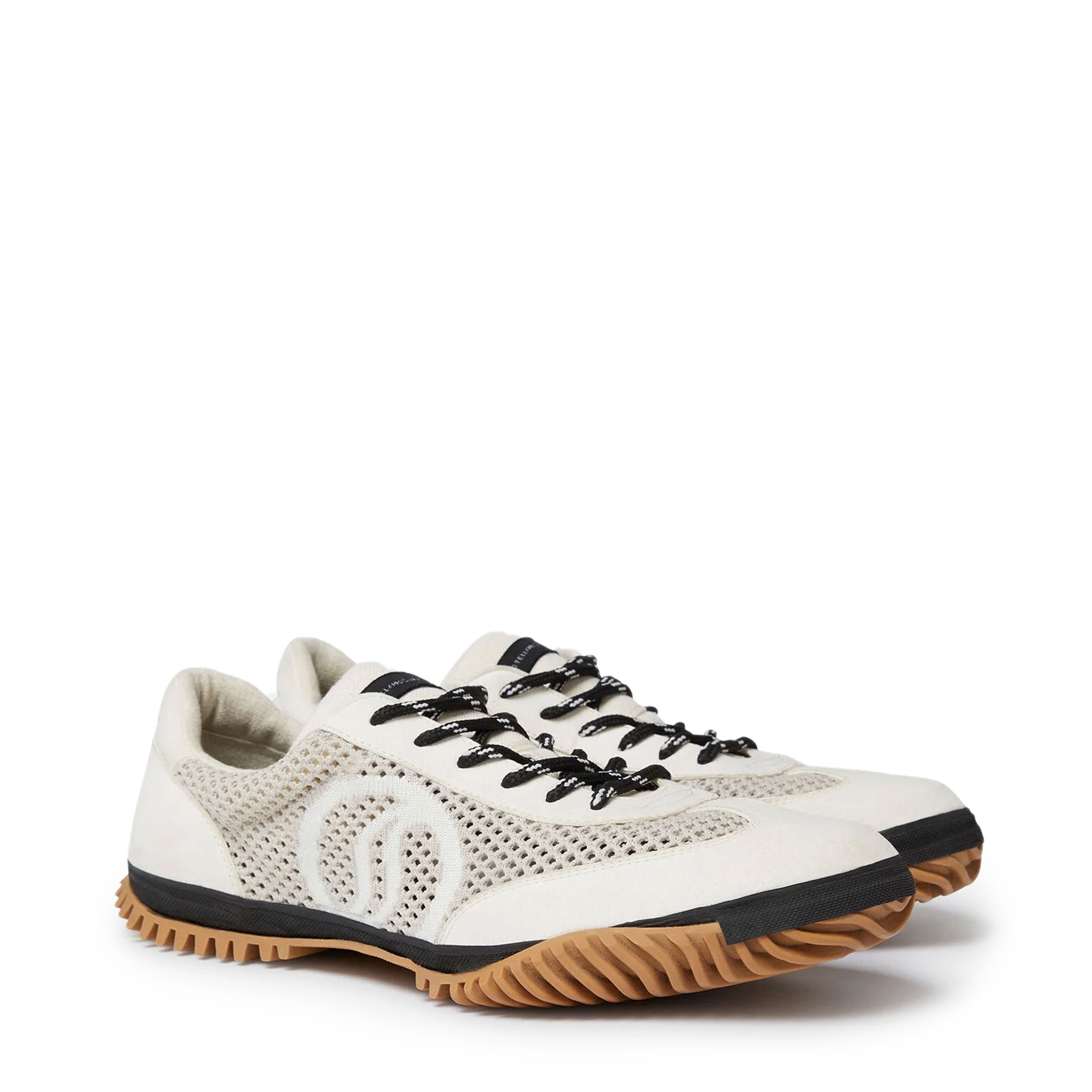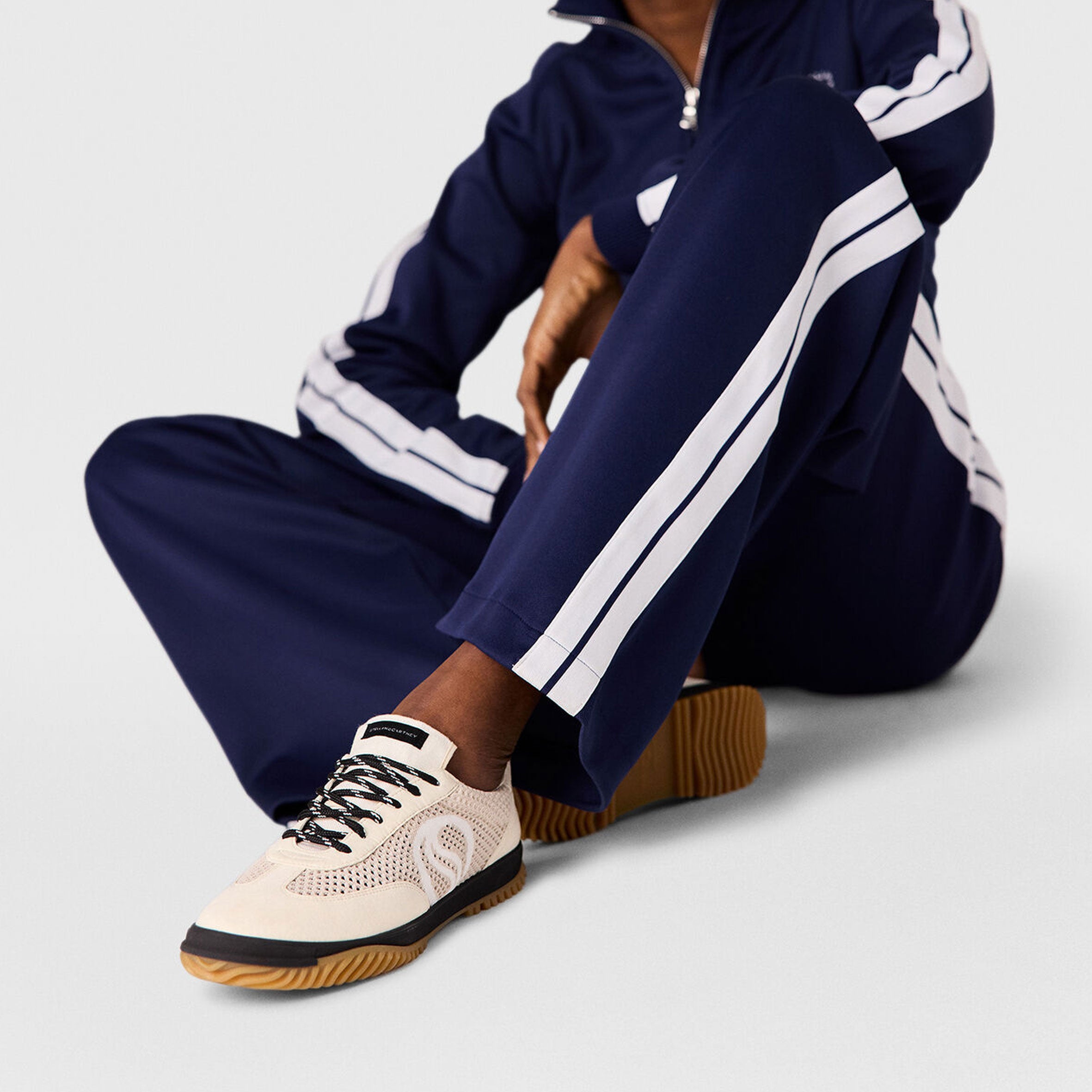 Stella McCartney revisits S-Wave trainers for Summer 2024 – with every component incorporating innovative alternatives. Inspired by vintage runners, the neat, sleek upper silhouette is crafted from panels of breathable mesh using recycled fibres and resting upon a lightweight, supportive recycled rubber sole.
