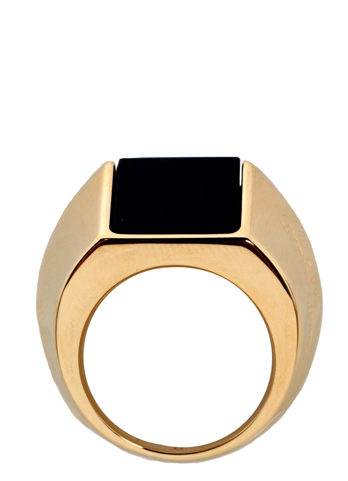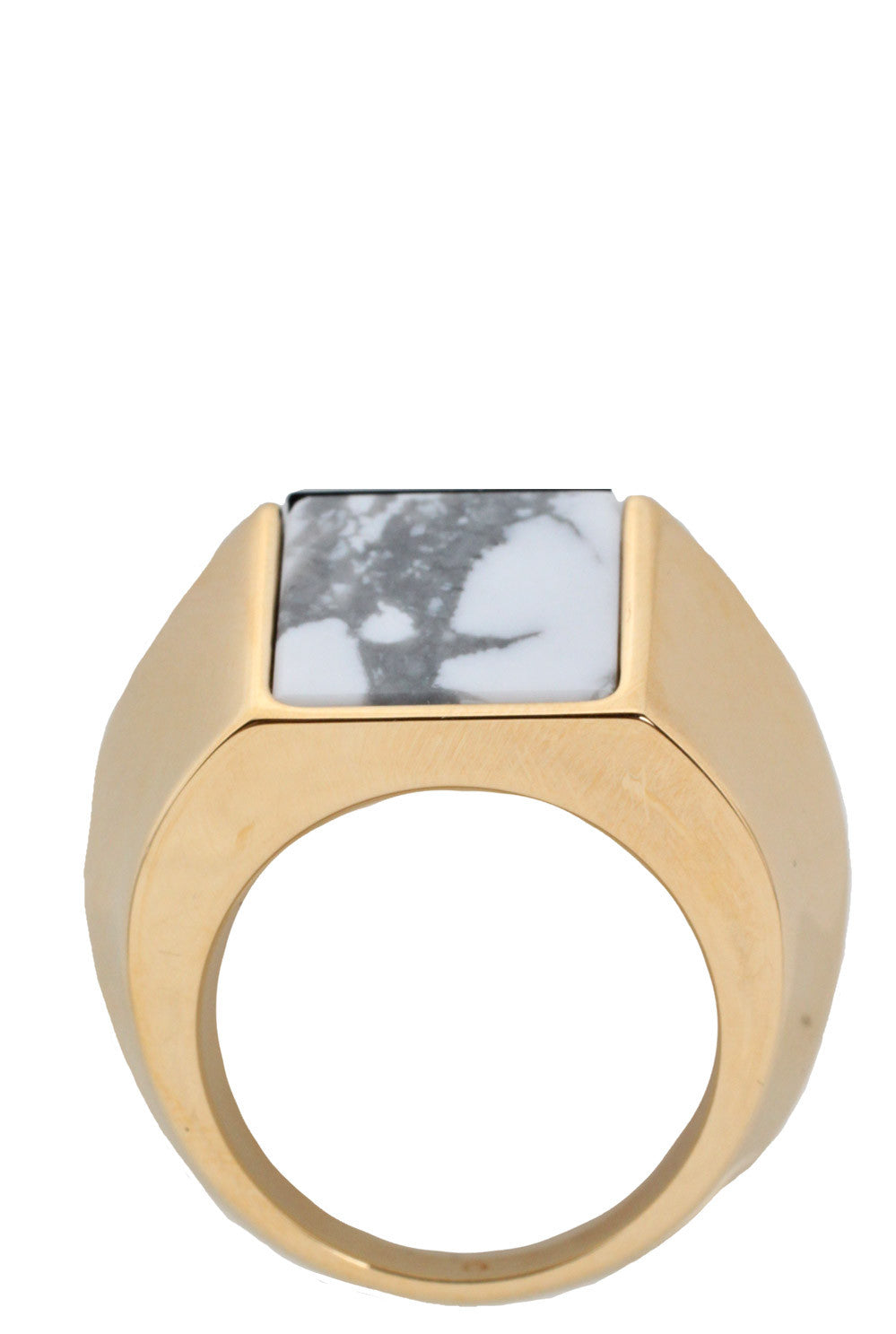 A thick graduated band with duo embedded Onyx/Howlite in gold-plated brass.