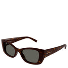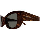 Cat eye Saint Laurent sunglass in a dark havana frame with grey mirror lenses. An ultra cat eye feminine style characterized by a narrow shape with pointy angles. The style is enriched by an exaggerated play of volumes throughout front and temples. The logo is engraved and enriched with gray enamel.