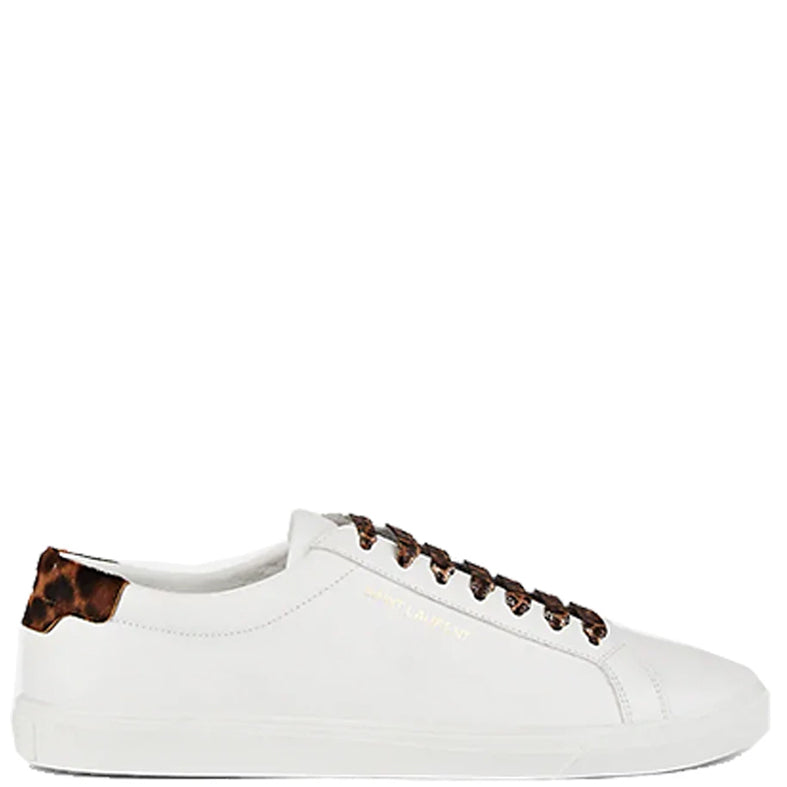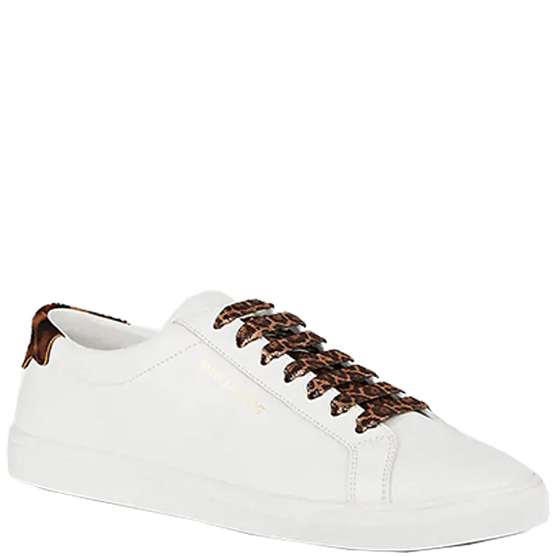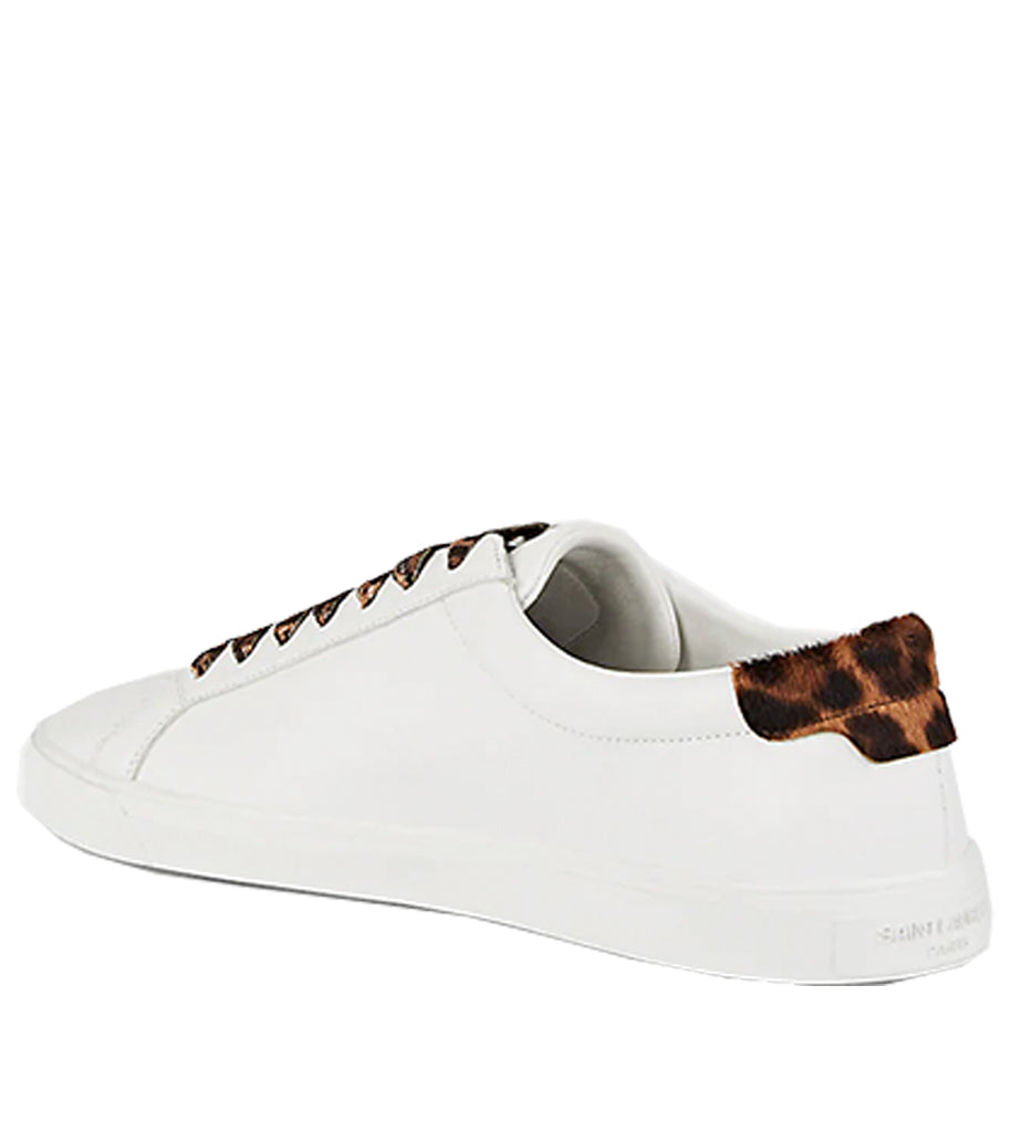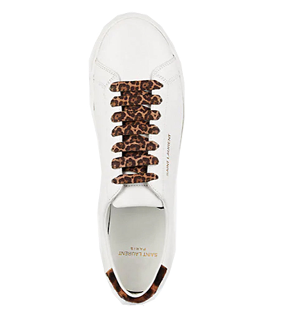 Low top laced sneakers finished in a pony skin leopard print and 'Saint Laurent' embossed on the side, pull tab and the back of the heel.