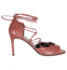 Jane 80 peep toe lace-up sandal in dark pink lizard embossed leather. Mid heel stiletto sandal with intertwining straps.