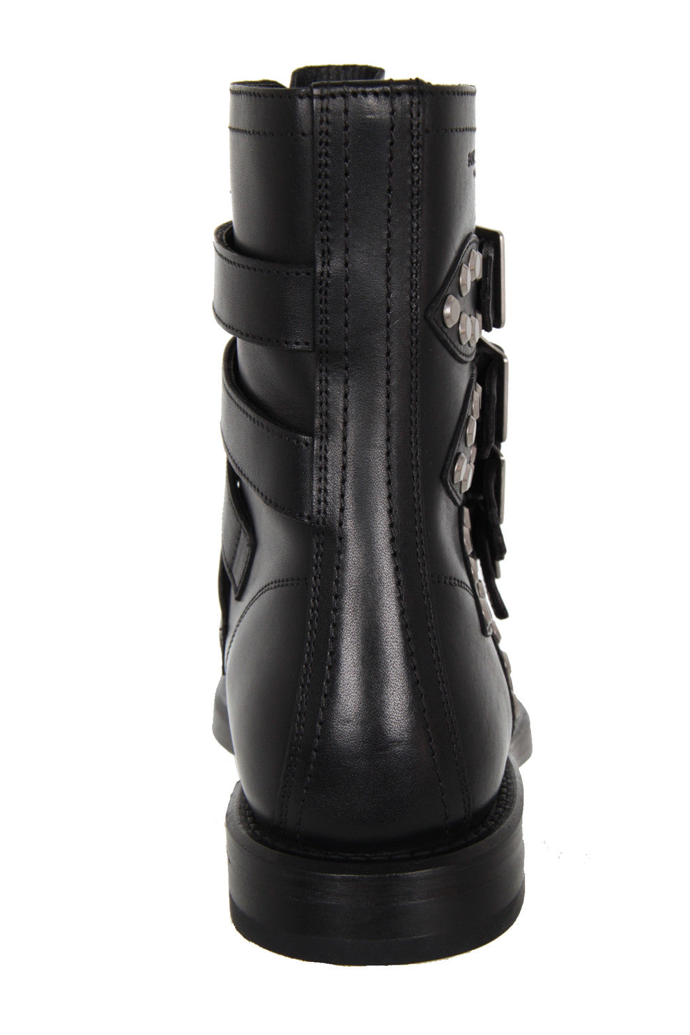 Classic lace-up utilitarian boot with 4 adjustable straps with saint laurent engraved buckles and flat studs and on the strap of each strap.