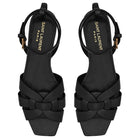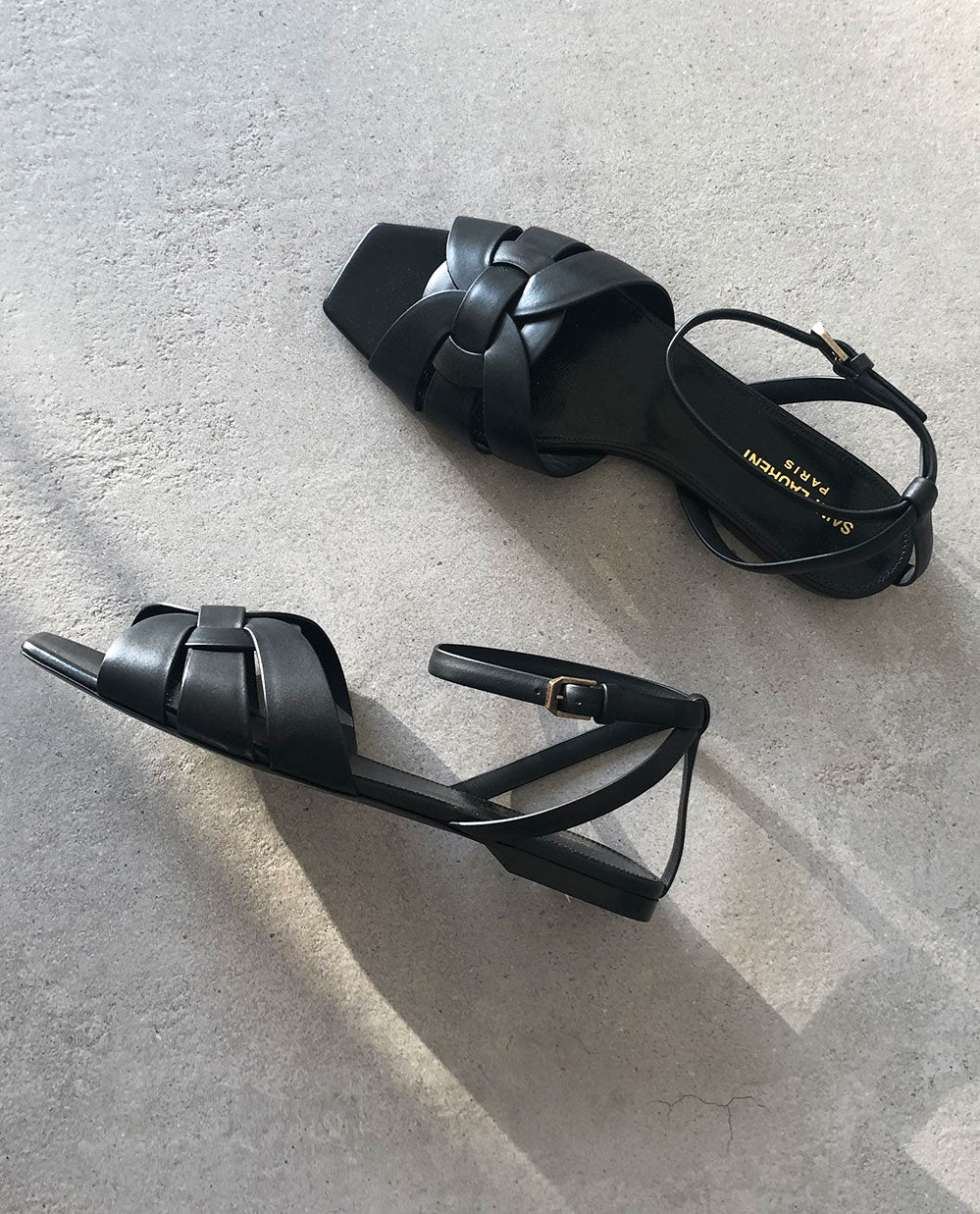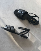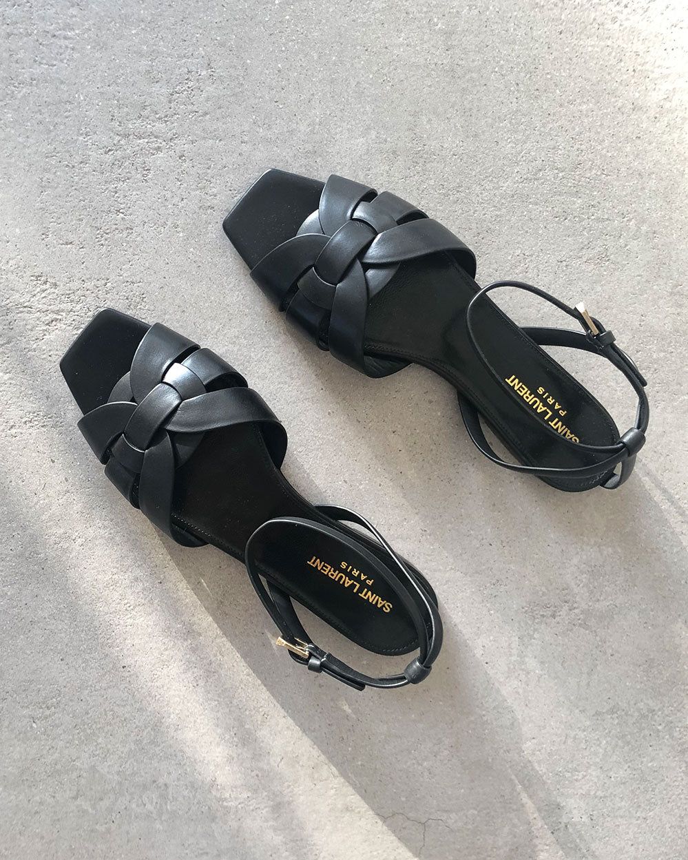 Adjustable ankle strap slip-on sandals with a square toe and intertwining straps. 100% calfskin leather with bronze tone hardware.