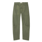 Mid-rise, relaxed fit barrel leg pant. Uniquely curved silhouette. Seam detail at knees. Gusset at inseam. Zip fly. Hidden hook-and-bar closure. Hidden stay button closure. Top-stitched front and back patch pockets. Belt loops.