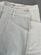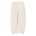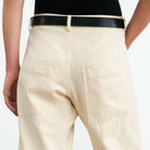 Mid-rise, relaxed fit barrel leg pant. Uniquely curved silhouette. Seam detail at knees. Gusset at inseam. Zip fly. Hidden hook-and-bar closure. Hidden stay button closure. Top-stitched front and back patch pockets. Belt loops. The Stone colour has a cool grey undertone whilst the eggshell is a warm white (last photo shows the stone on top of the eggshell).