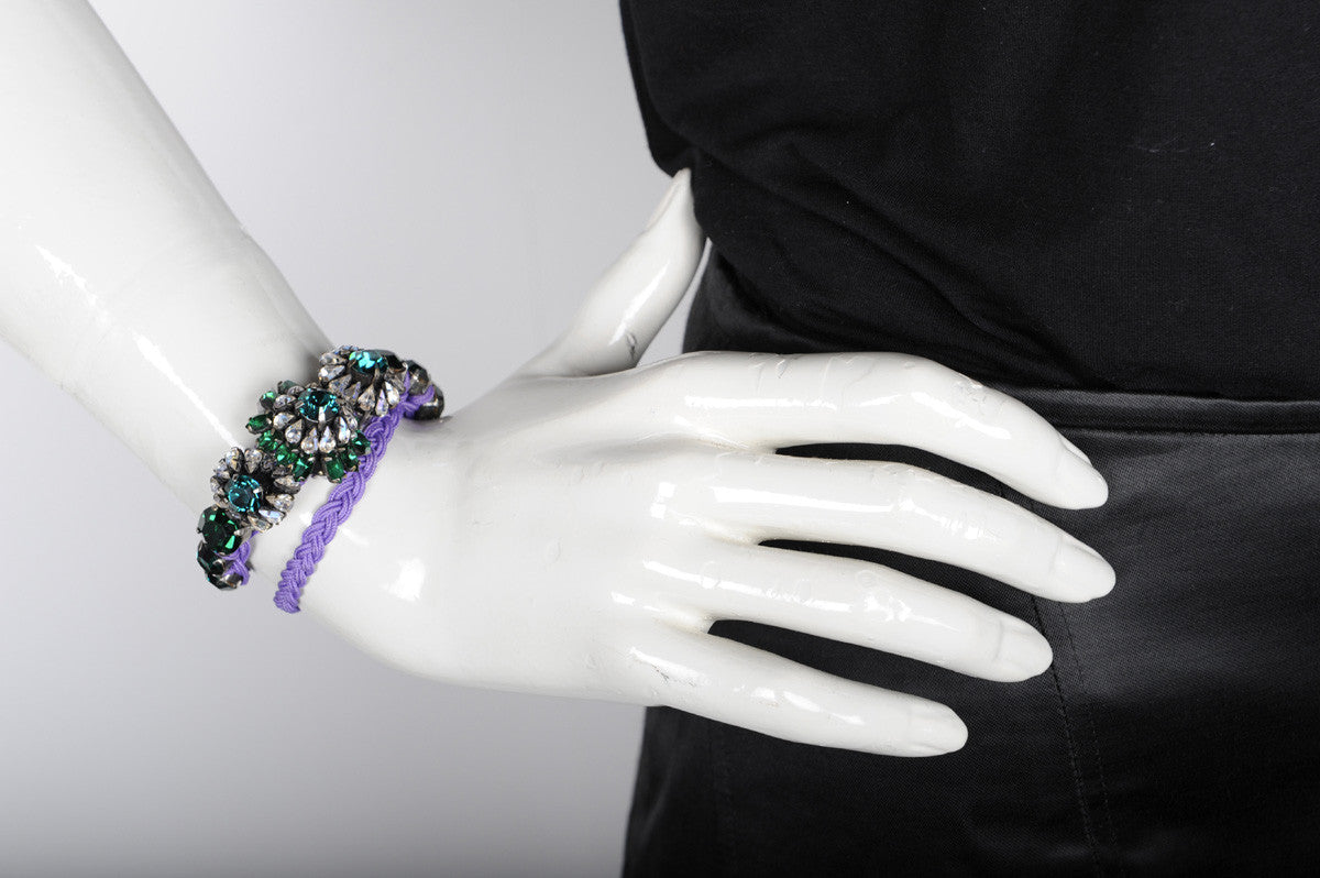 The BARAKA Rococo bracelet by Shourouk. Double wrap length braided rope bracelet embroidered withcrystal and colour crystal and Swarovski elements. Rhinestone-encrusted pinch clasp closure.