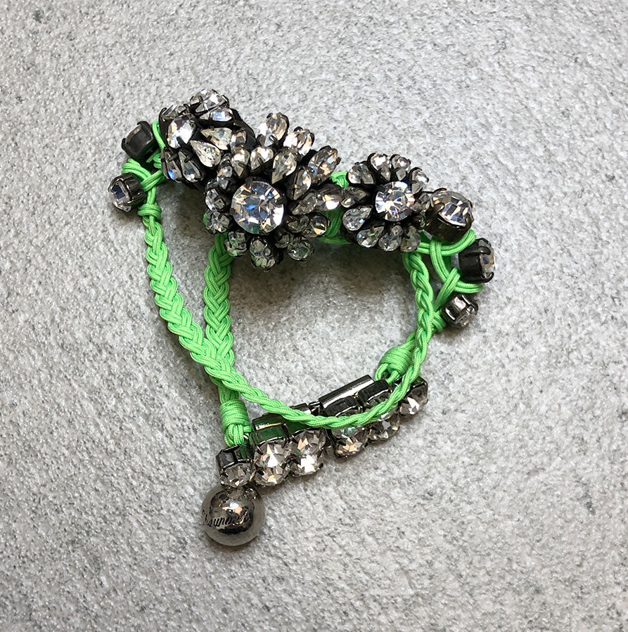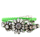 Neon green rope bracelet which wraps around the wrist twice with floral crystal centre design and crystal clasp.