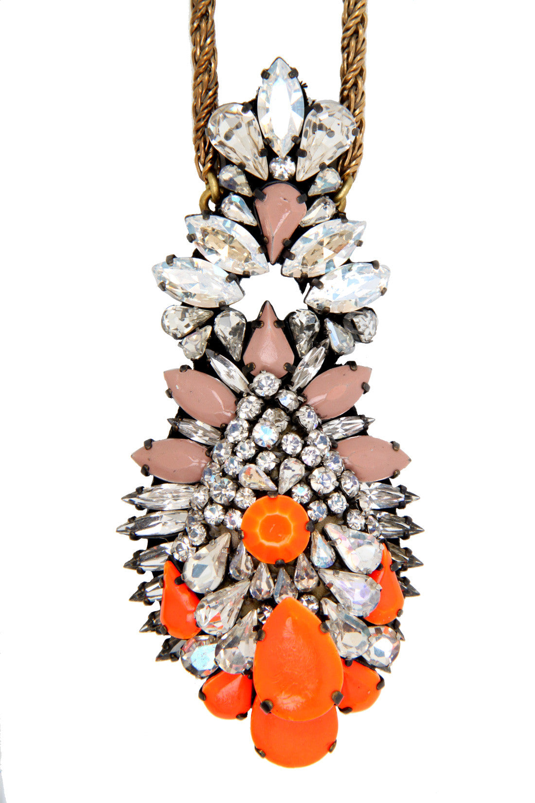 The Leitmotiv Zambia pendant necklaceby Shourouk features a large floral motif embroidered with a mix of clear crystals, neon-orange and pale-pink hand painted enameled crystals. Brass chain withlobster claw fastening and logo engraved silver ball charm.