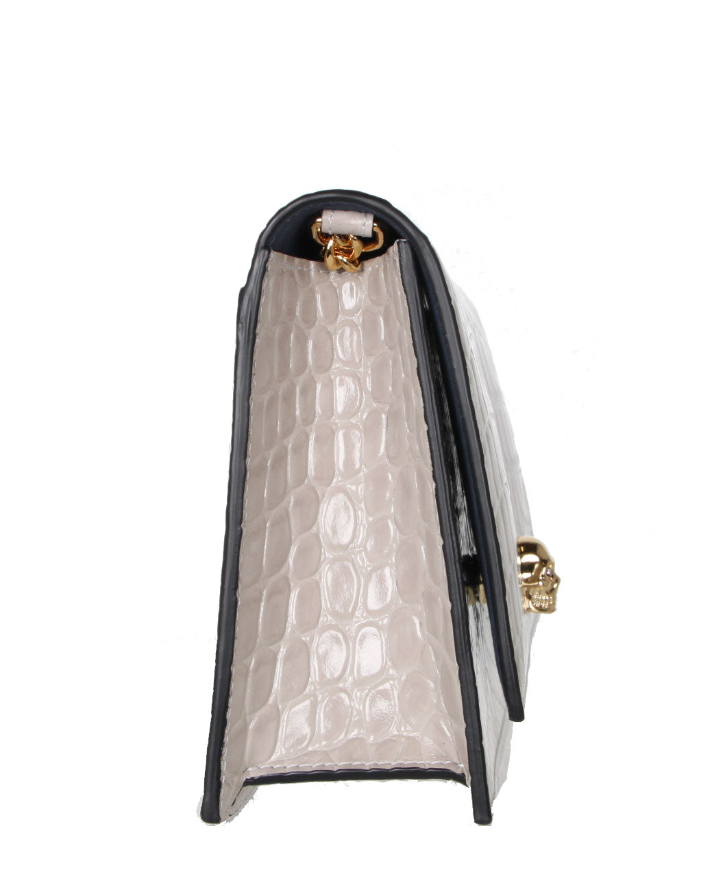 Alexander McQueen grey shiny croc-effect leather Medium Skull bag with a gold finished skull and chain strap. This bag features one central compartment, one card pocket and snap button closure. Accomodates smartphones.