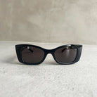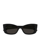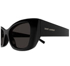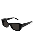 Cat eye Saint Laurent sunglass in a dark havana frame with grey mirror lenses. An ultra cat eye feminine style characterized by a narrow shape with pointy angles. The style is enriched by an exaggerated play of volumes throughout front and temples. The logo is engraved and enriched with gray enamel.