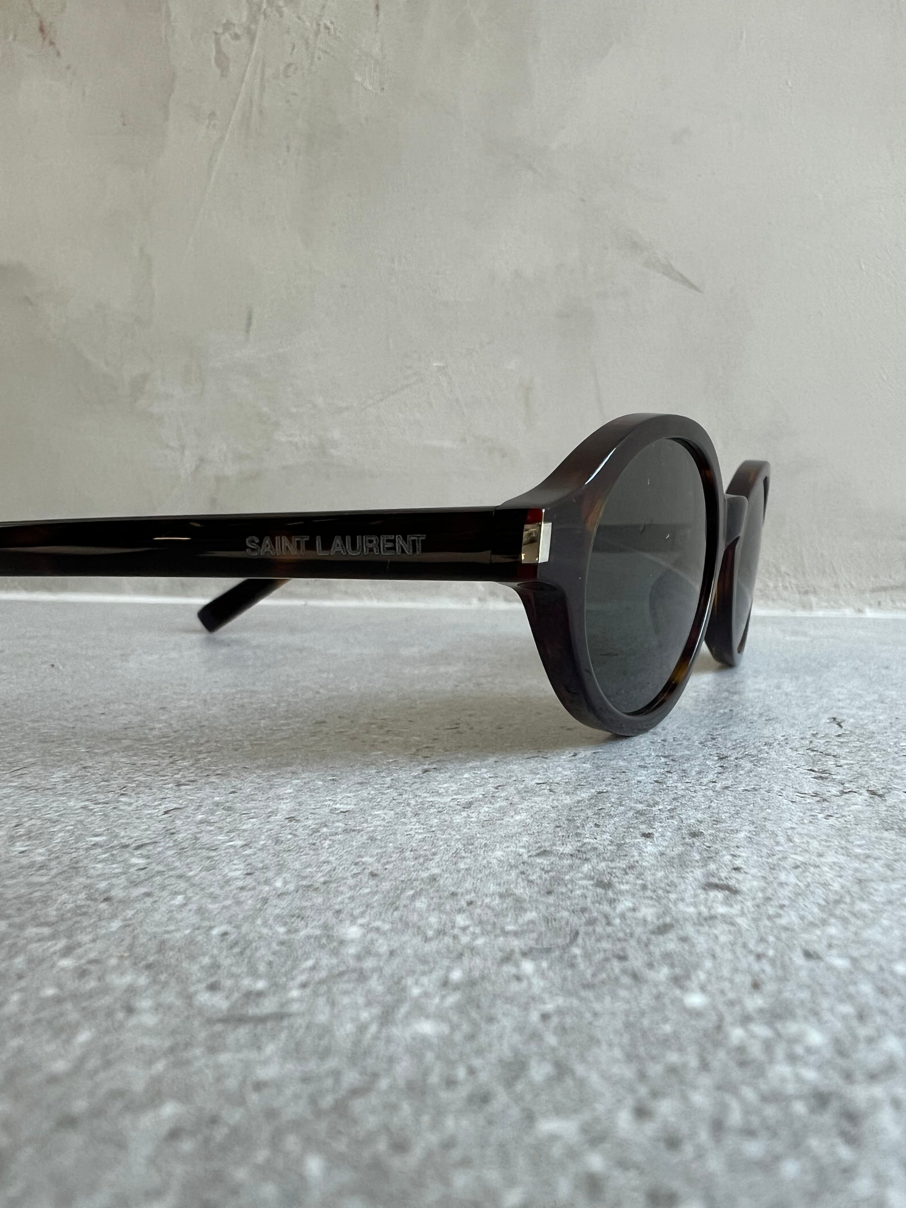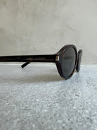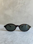 Sunglasses with a narrow elongated cat-eye frames in acetate with nylon lenses.