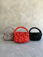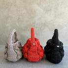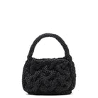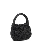 A hand knitted leather top handle bag featuring silver bead with logo engraving on left side handle.