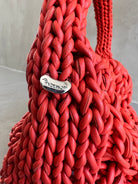 A hand knitted leather top handle bag featuring silver bead with logo engraving on left side handle.