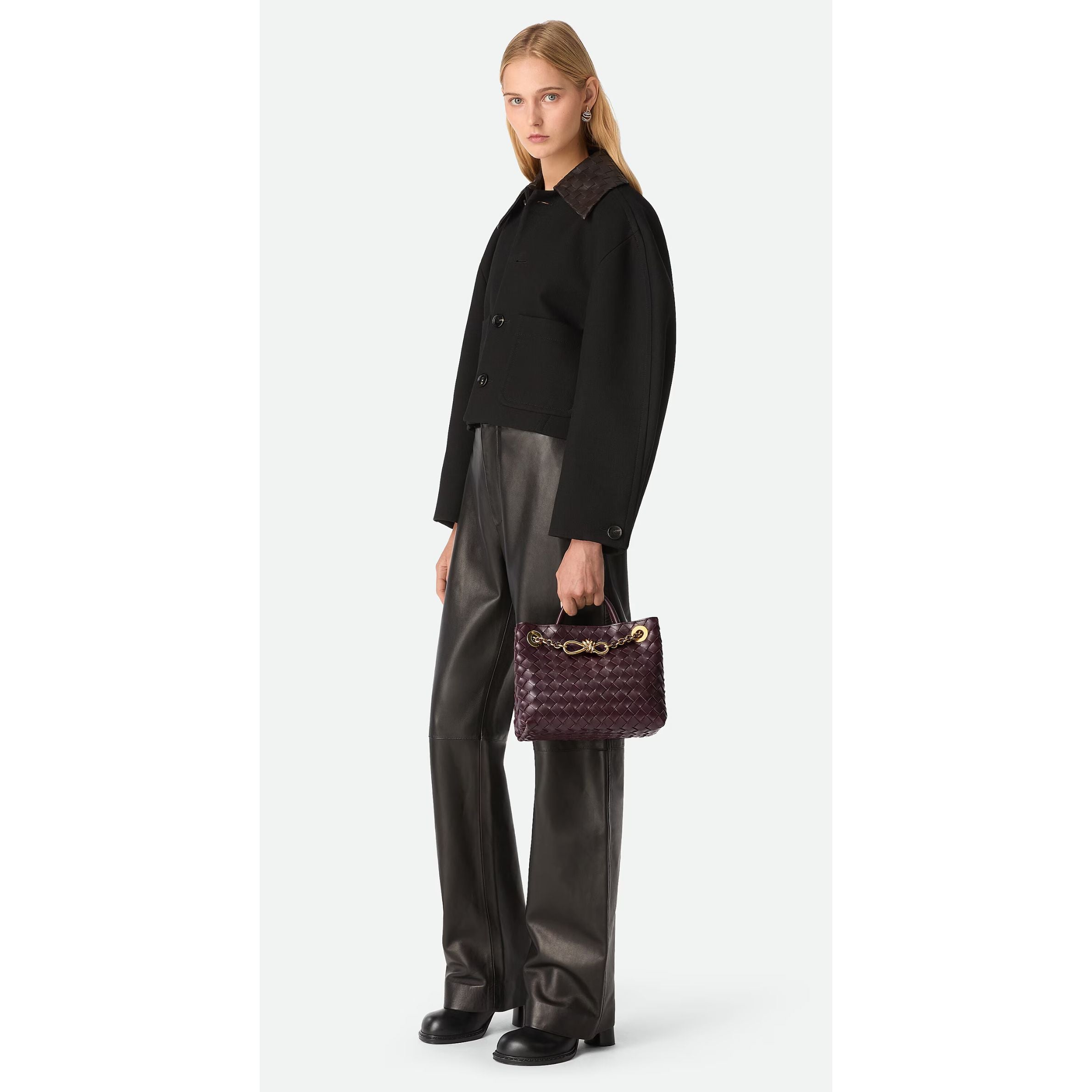 Andiamo is a new expression of the signature Intrecciato weave realised by the expert craftsmanship of artisans in the house’s atelier. Its name, Andiamo, “Let’s go” in Italian, embodies the spirit of the bag, a tribute to going places and the concept of craft in motion. The bag features a timeless Intrecciato silhouette woven by hand. A metal knot adorns and fastens its sliding braided straps, allowing it to be adjusted over the shoulder or across the body, giving the bag a soft tapered volume.