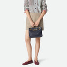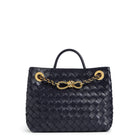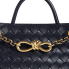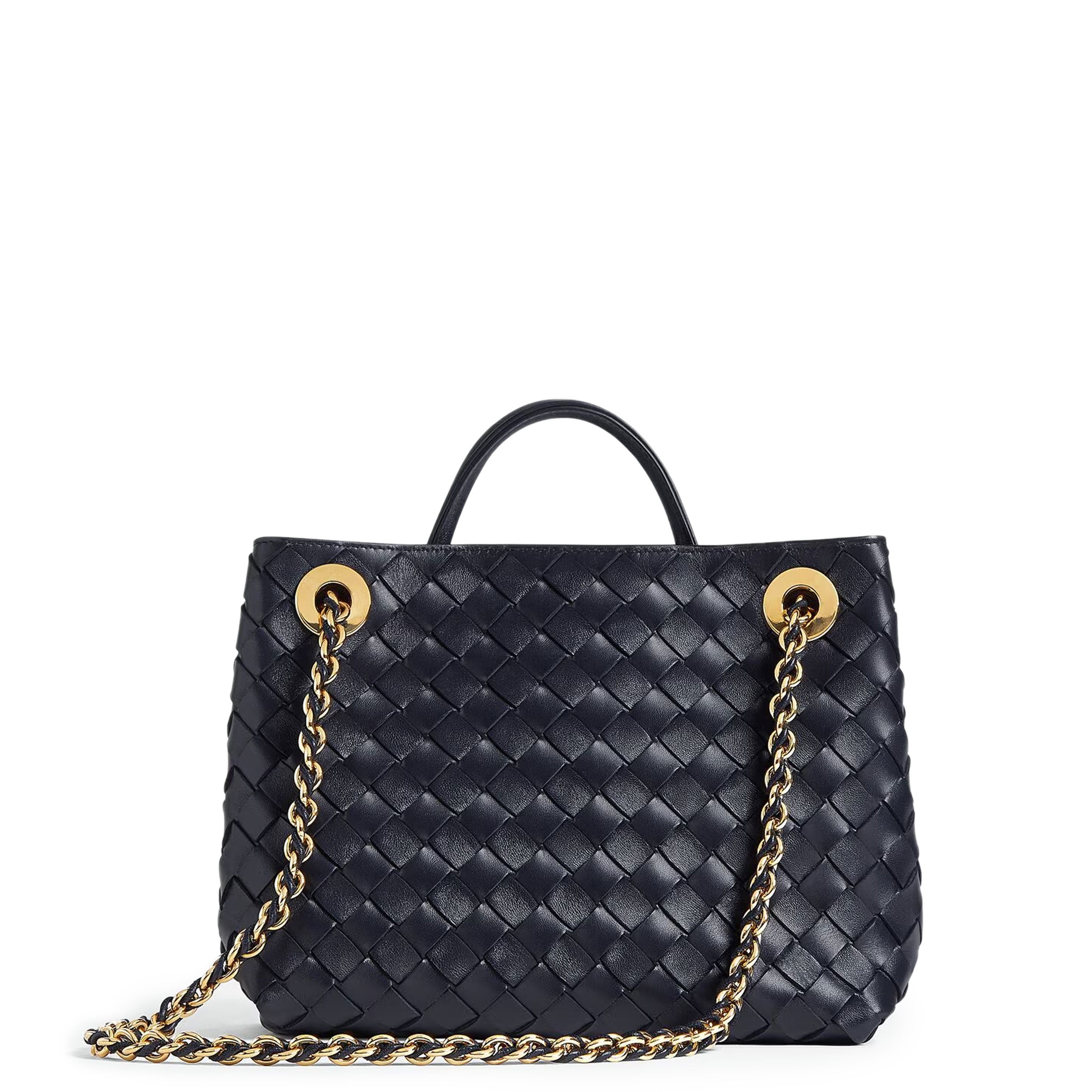 Small Intrecciato leather top handle bag with sliding cross-body strap • Compartmented interior with one zipped pocket, two open pockets • Magnetic closure