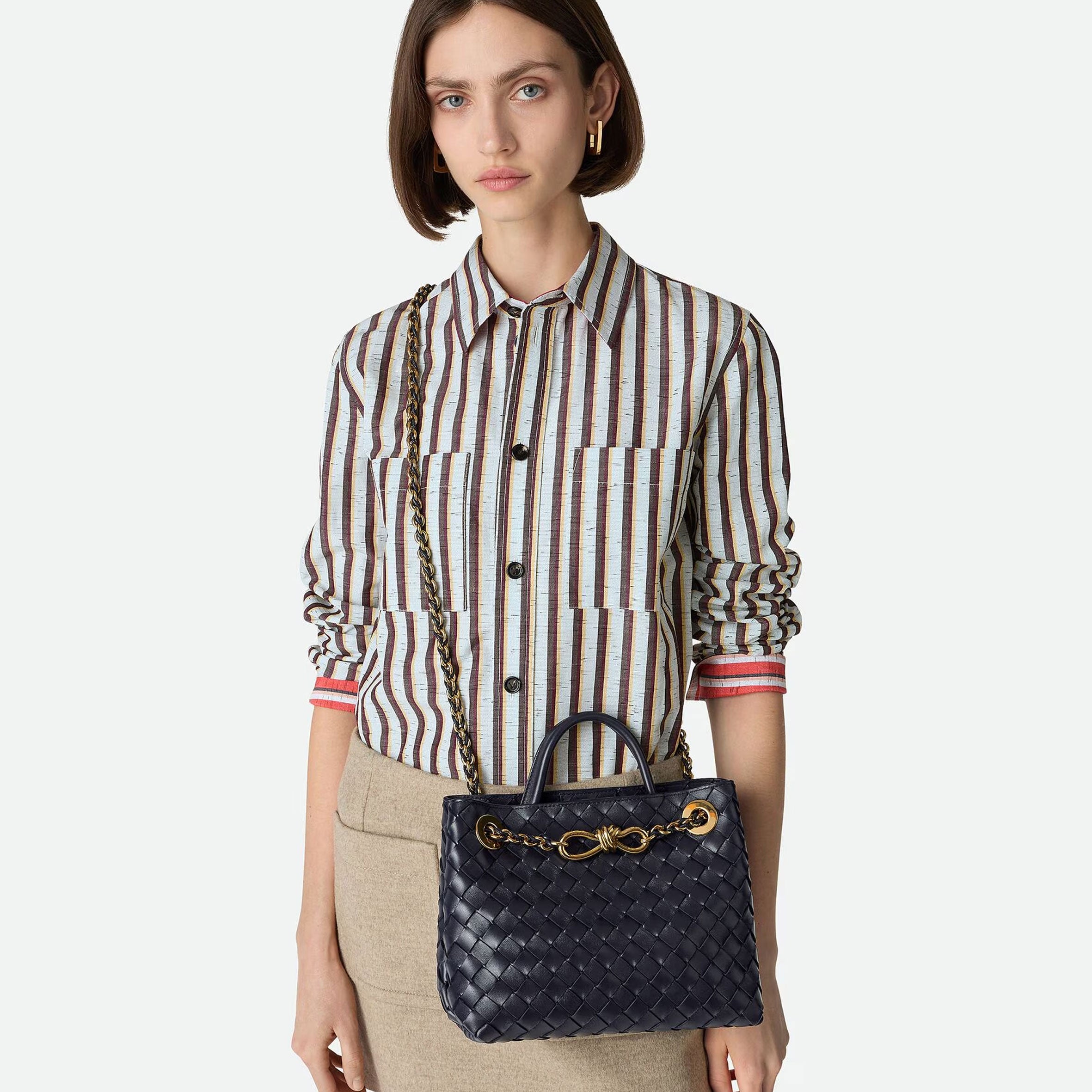 Andiamo is a new expression of the signature Intrecciato weave realised by the expert craftsmanship of artisans in the house’s atelier. Its name, Andiamo, “Let’s go” in Italian, embodies the spirit of the bag, a tribute to going places and the concept of craft in motion. The bag features a timeless Intrecciato silhouette woven by hand. A metal knot adorns and fastens its sliding braided straps, allowing it to be adjusted over the shoulder or across the body, giving the bag a soft tapered volume. This version also features a tubular