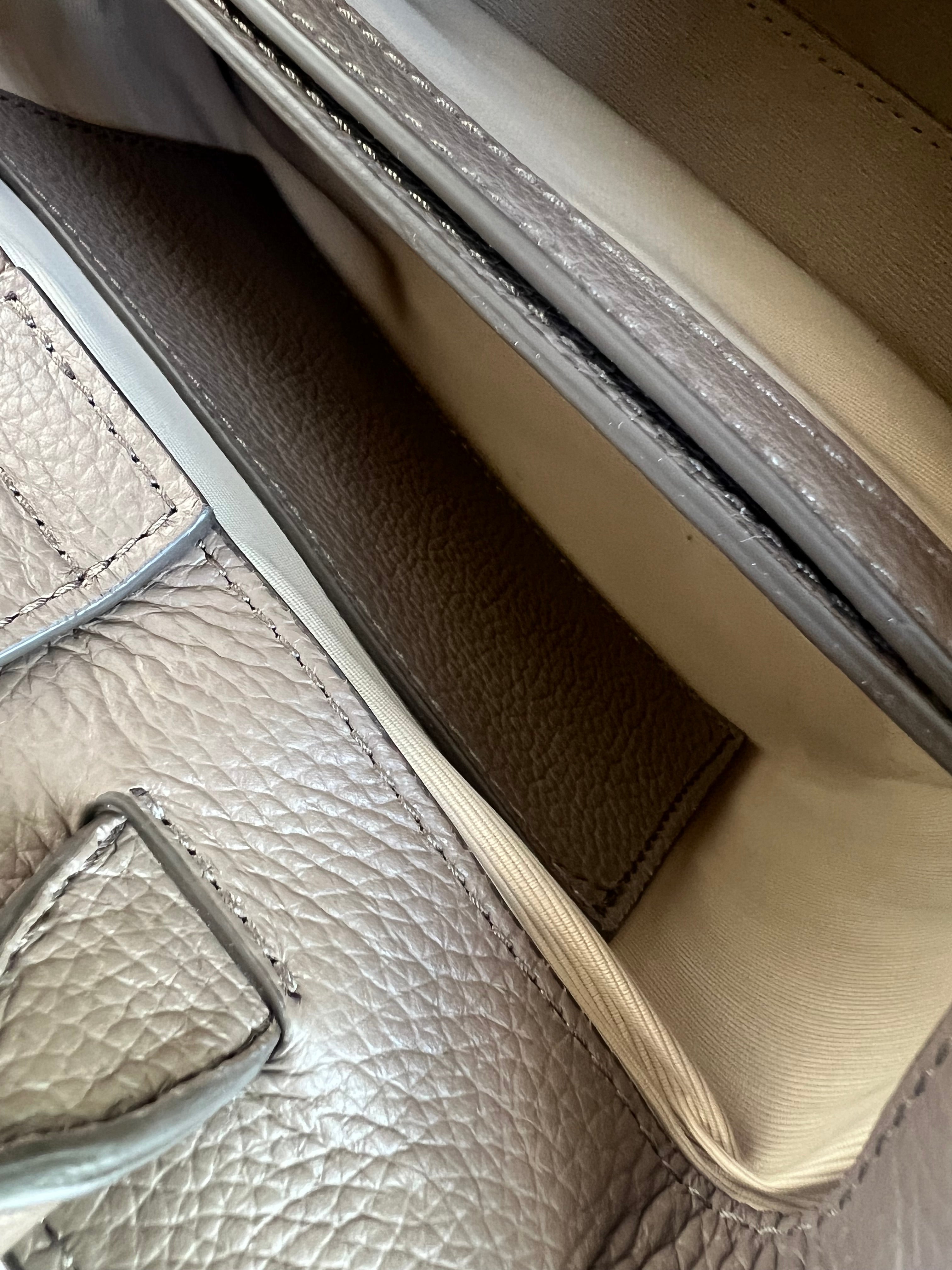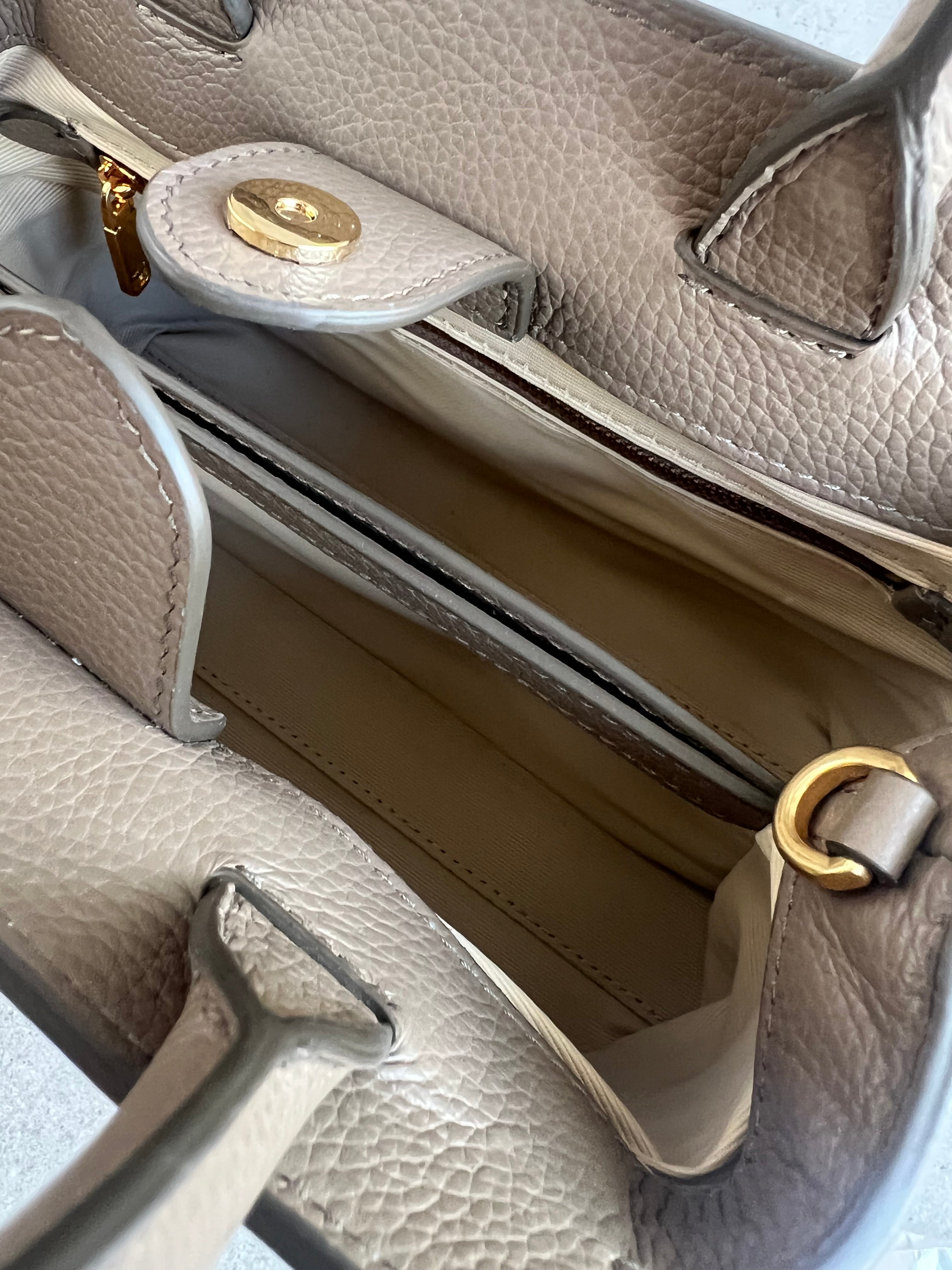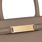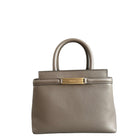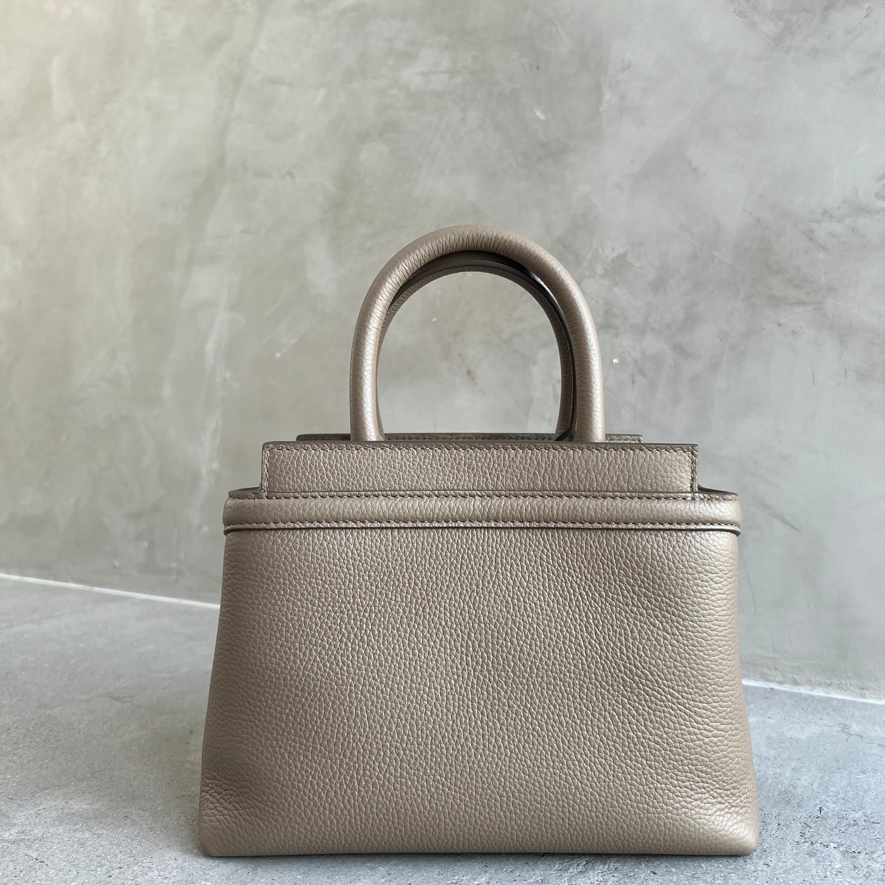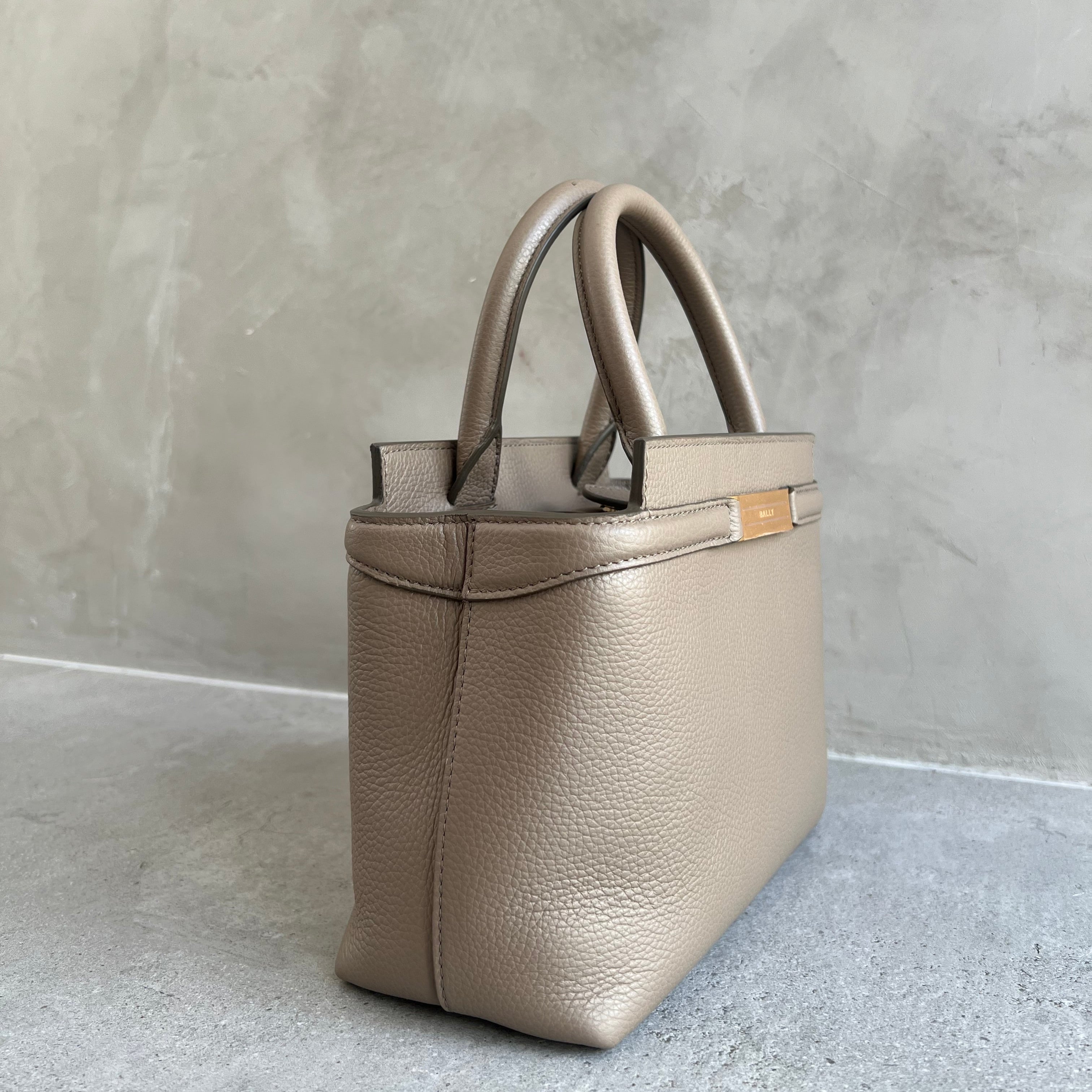 This small Deco tote bag in supple sepia calfskin is trimmed by a metal plaque, a simple signifier that recalls the Bally Ribbon. Top handles and a removable shoulder strap offer multiple carry options.