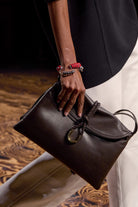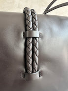 Cross-body bag in smooth calf leather with double flap. Fastened with a sculptural metal closure and leather coaxial cord.