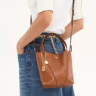 The compact interior combines with double handles and a removable strap. Wear on the shoulder, crossbody, or slide the handles through the ring for relaxed hand or wrist carry.