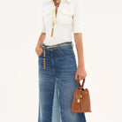 Crafted from shiny grained cowhide, the small Chloé Spin tote bag has a minimalist silhouette elevated with graphic lines. A dangling chain features the Maison's signature Chloé and Horse Medals.