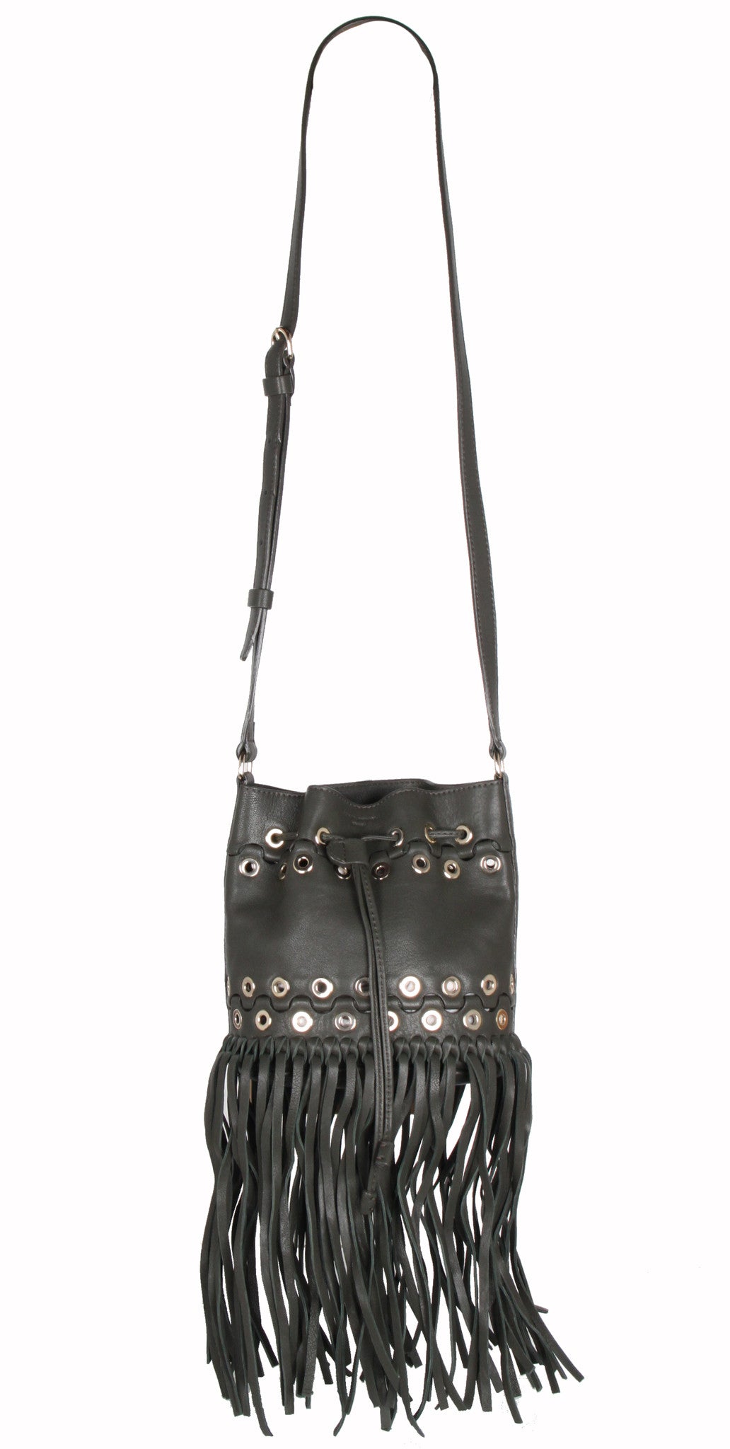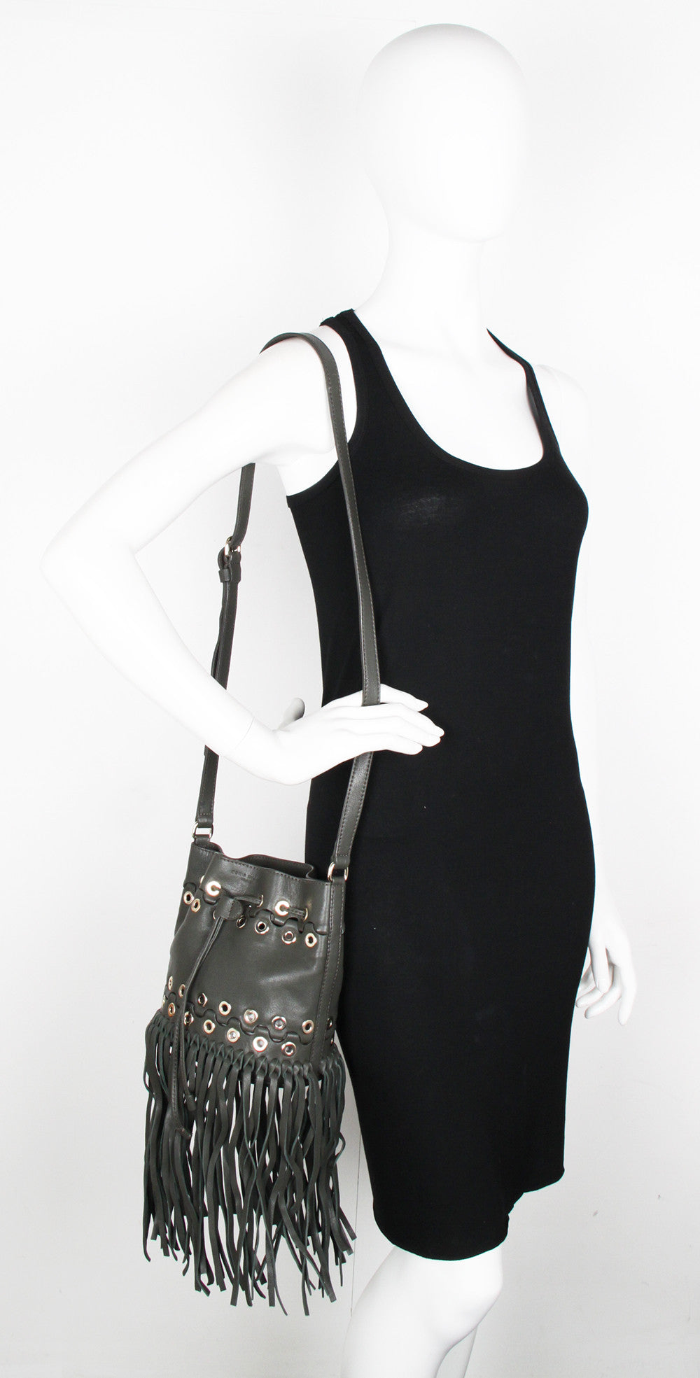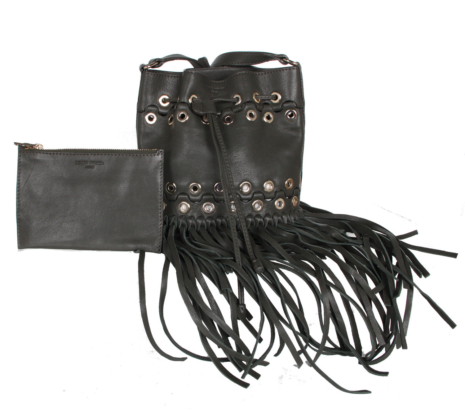 Invest in this seasons hottest fringe design with Sonia Rykiel's cross body bucket bag. Featuring a washed leather finish; light gold eyelets; cotton twill lining; and small interior pouch pocket for mobile phone or keys.