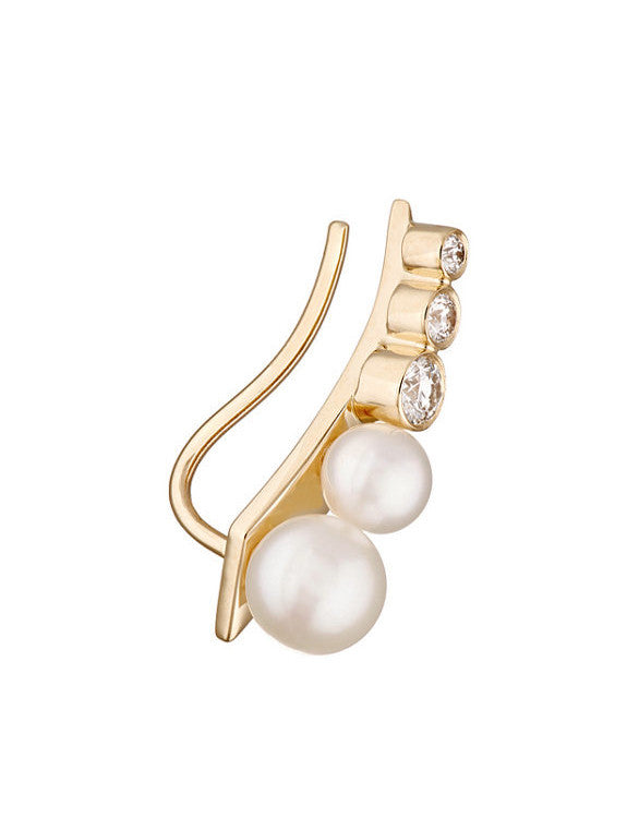 Two Akoya pearls with three white diamonds in descending size follow the contour of the ear. 18 kt. yellow gold with total carat weight of 0,13 ct. Top Wesselton VVS Diamonds .13 carat. Hook back for pierced ears.