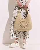 The slouchy Logo hobo tote bag is reimagined for High Summer in renewable raffia, handwoven in a fair-trade and safe workshop by female artisans in Madagascar – keeping traditional skills alive whilst protecting our planet for tomorrow. Raffia is an incredibly durable, easy-to-grow plant that supports soil health and absorbs greenhouse gasses. The luxury vegan bag is hand-finished with a Stella McCartney logo, embroidered on the front and lined with soft organic cotton