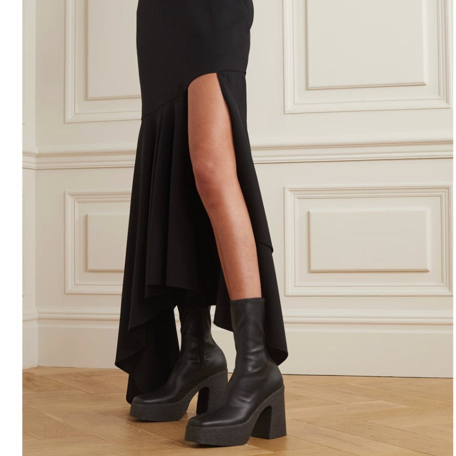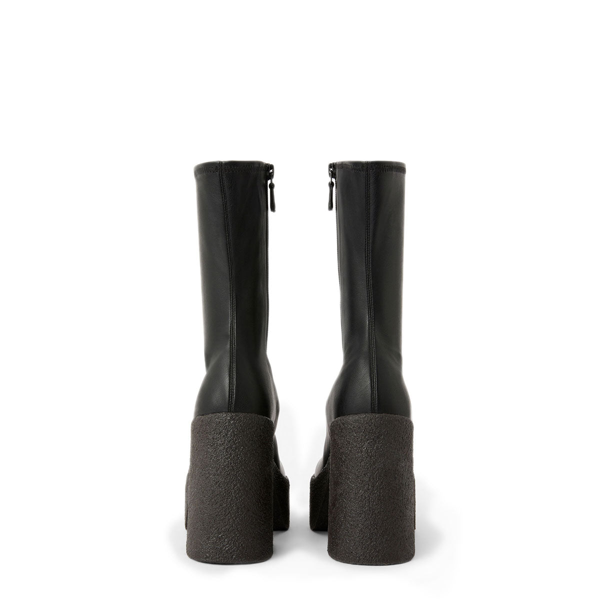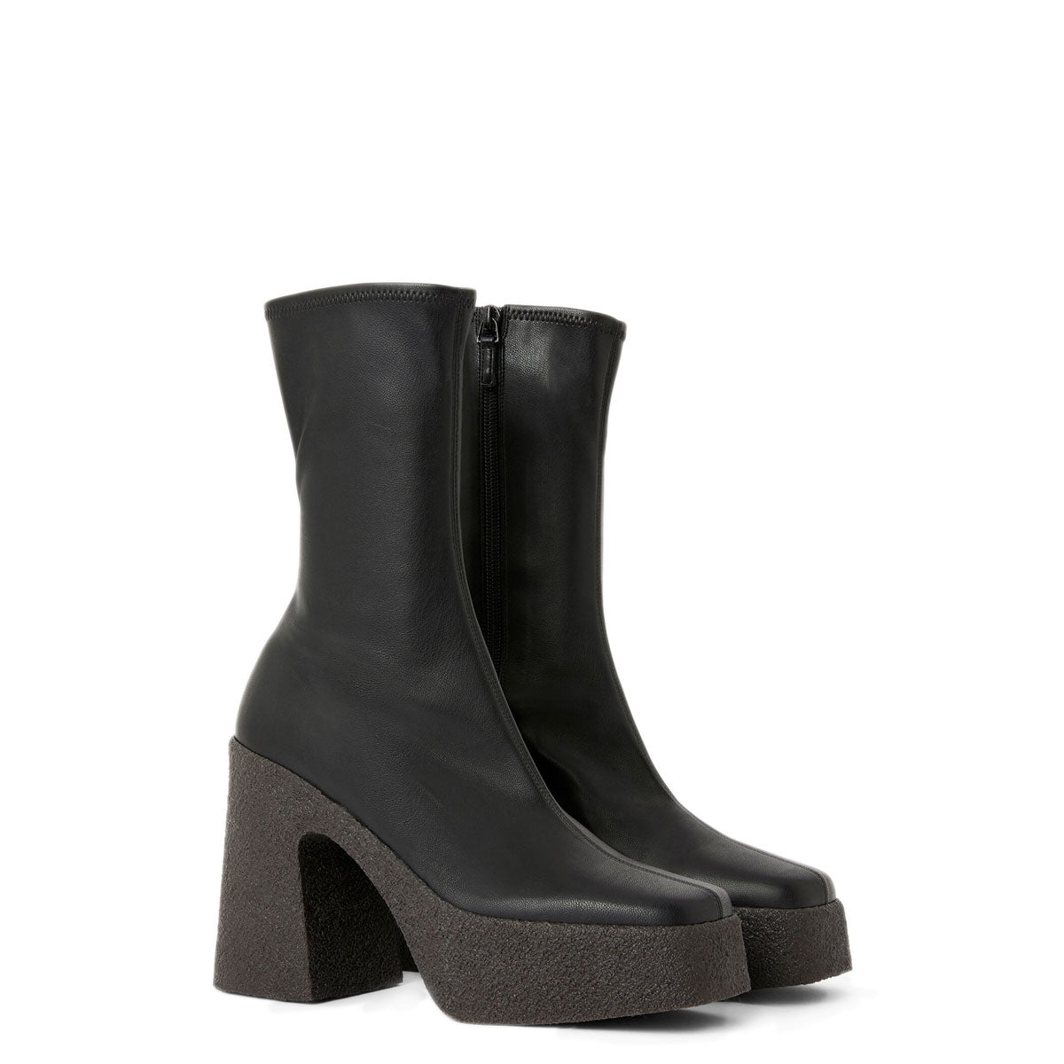 Elevate your foundational wardrobe with these Skyla platform ankle boots in stretch Alter Mat vegan leather. A timeless Stella icon, these ankle boots have a signature angular square toe and textured platform sole and block heel.