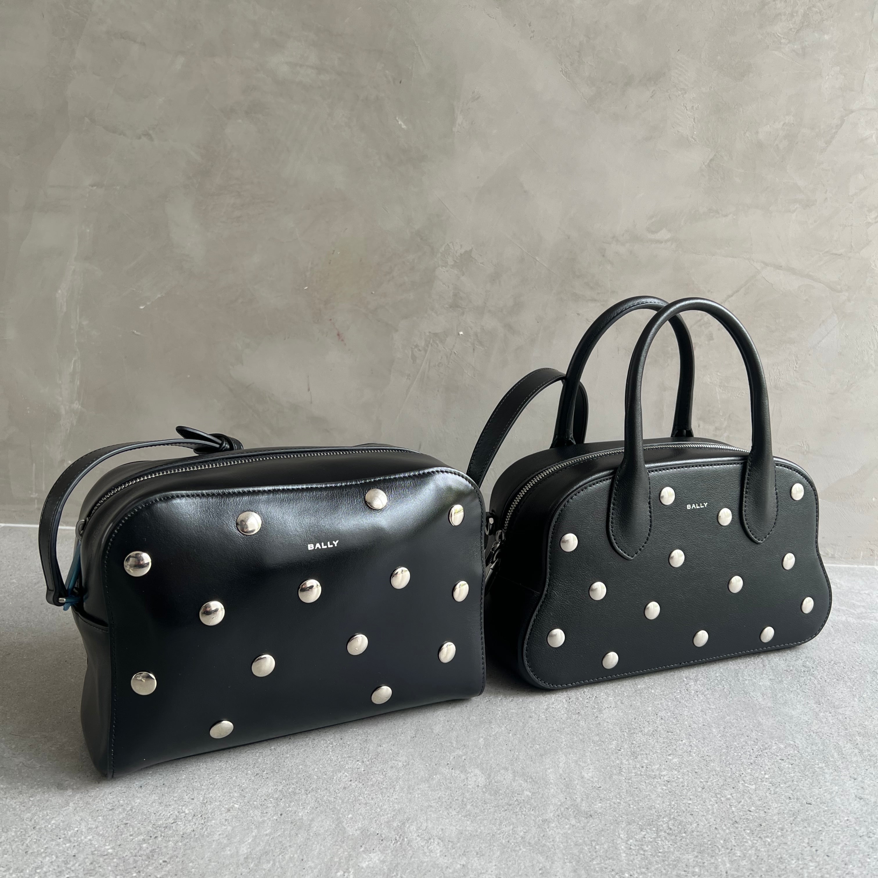 This Easy Bally crossbody bag is a sophisticated and versatile accessory. Creafted in black shiny calfskin with stud details and a small silver-tone foil logo on the front.