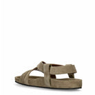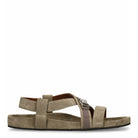 The Promise Sandal in khaki suede features a metal buckle closure and a padded leather sole embossed with the Wales Bonner logo.