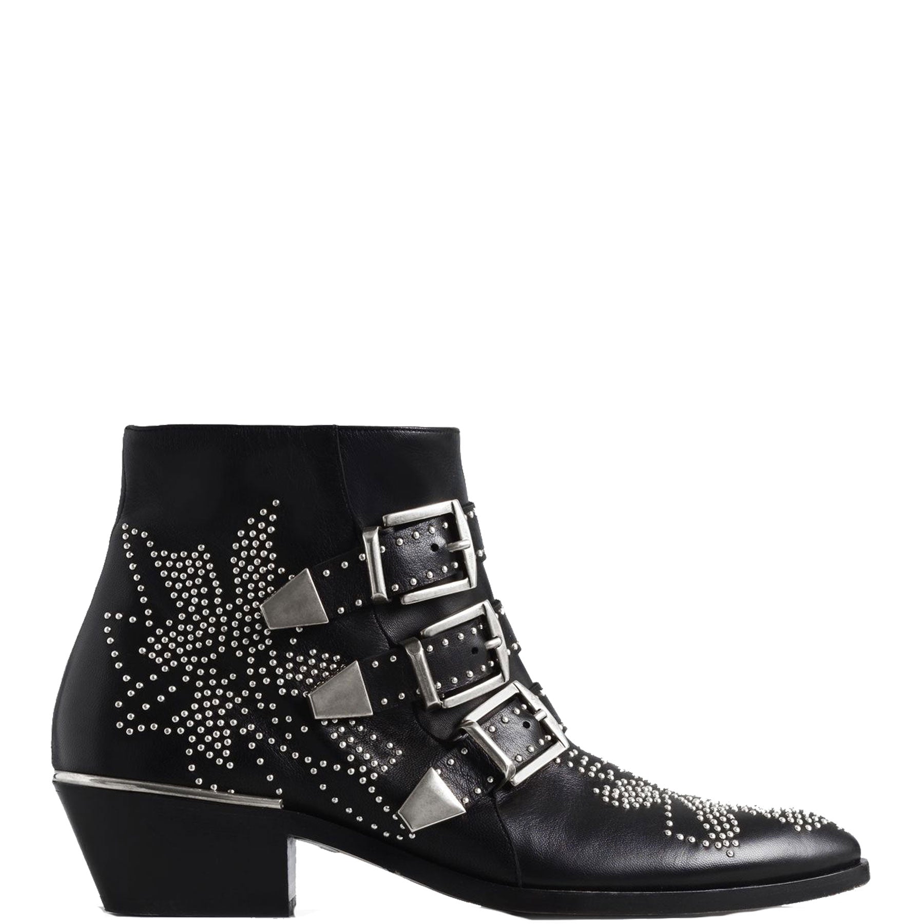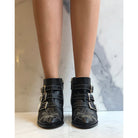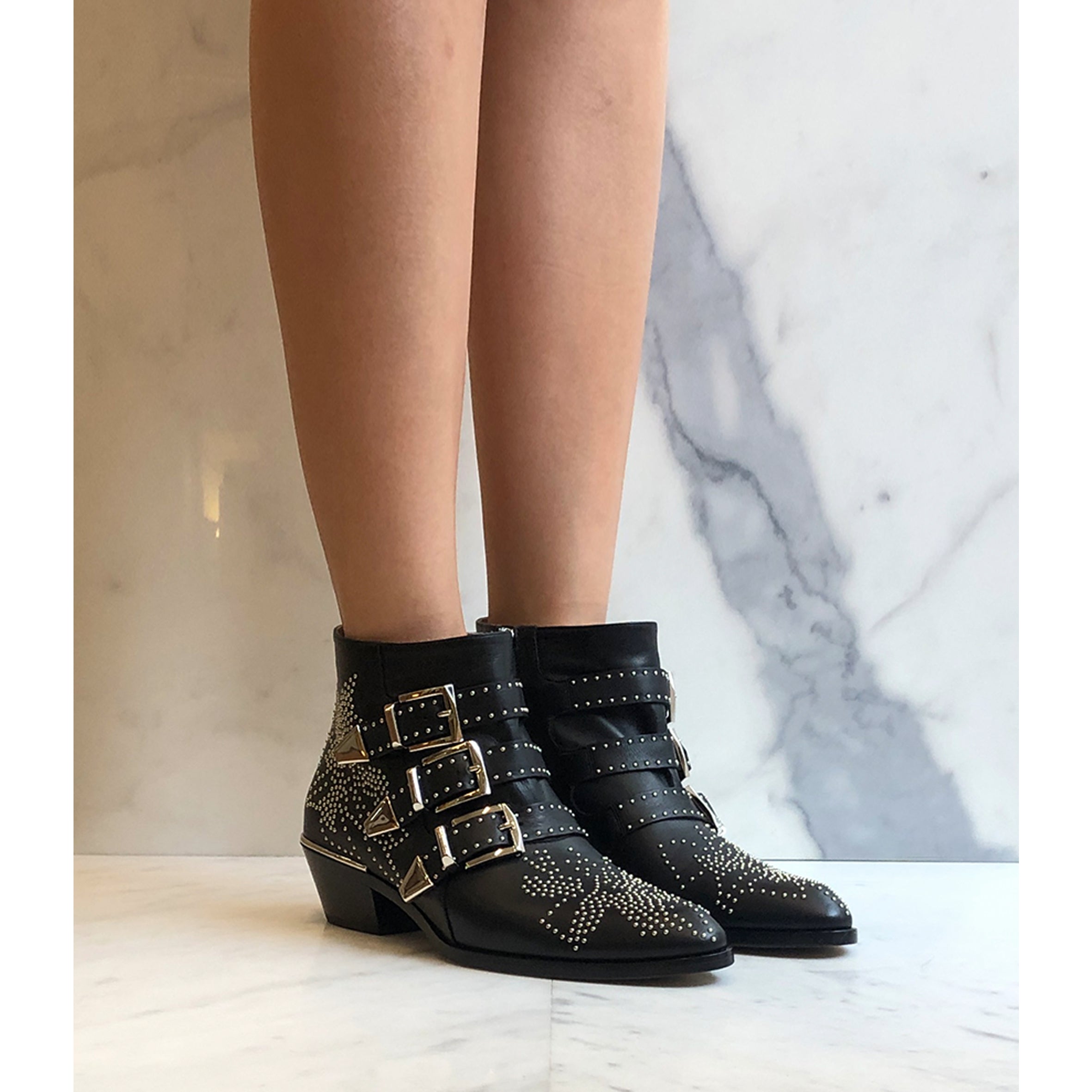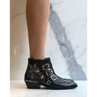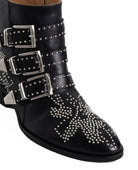 The statement Susanna Boots have a trio of buckled straps and elongated cowboy toe shape, and has a cool Western feel and sharp, yet feminine silhouette. Vintage metal pieces and silver studs in the Maison's own emblematic floral pattern pair with a strong Cuban heel and thick masculine sole. Zip on the side for easy wear.