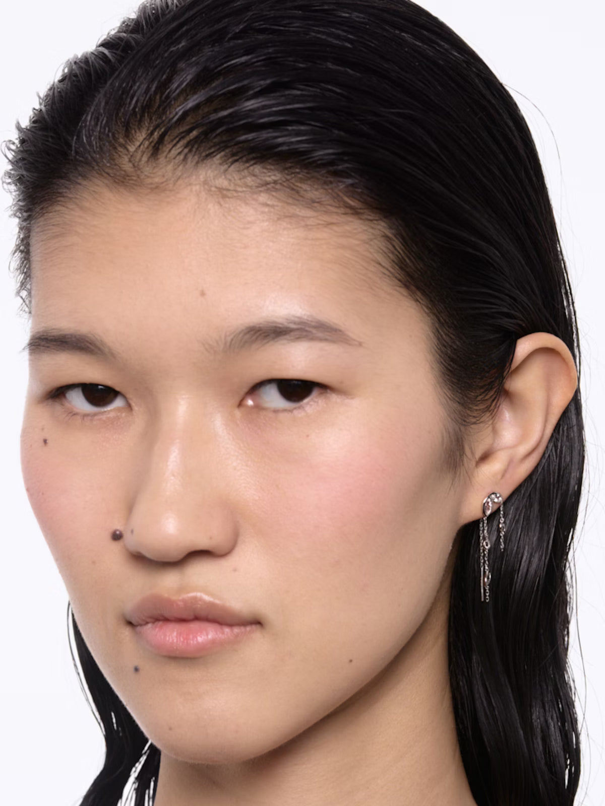 Featherlight everyday pull-through earring that creates the look of a double piercing when worn. Marquise and pear-cut white zirconia stones are offset in floating bezel settings and the stones are visible from the back due to the thin setting, creating optimal brilliance.