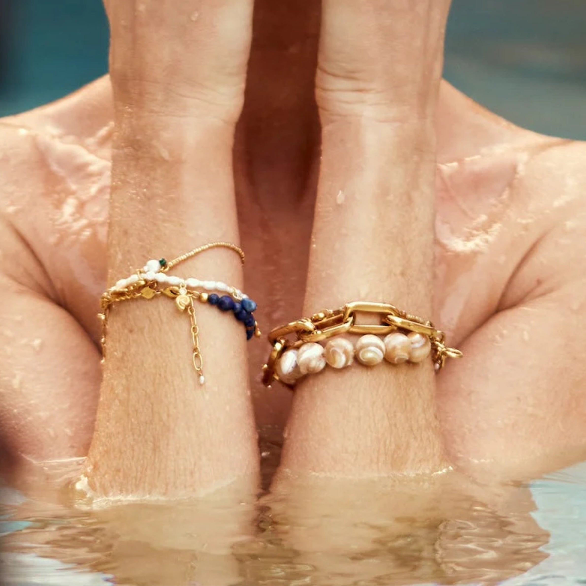 The gold combinations are plated with a thick layer of 18Kt gold - but kindly note that with time the plating will be worn off. This is normal and not a reason for a claim. We highly recommend to avoid lotion, hairspray and other cosmetics to be in contact with your jewelry. Please do not wear your jewelry while sleeping and doing sports. Please remember to avoid exposing your jewelry to water, salt, sun, chlorine and other chemicals - especially the designs with freshwater pearls. Please store your jewelry in a dry room jewelry box, never in the bathroom.