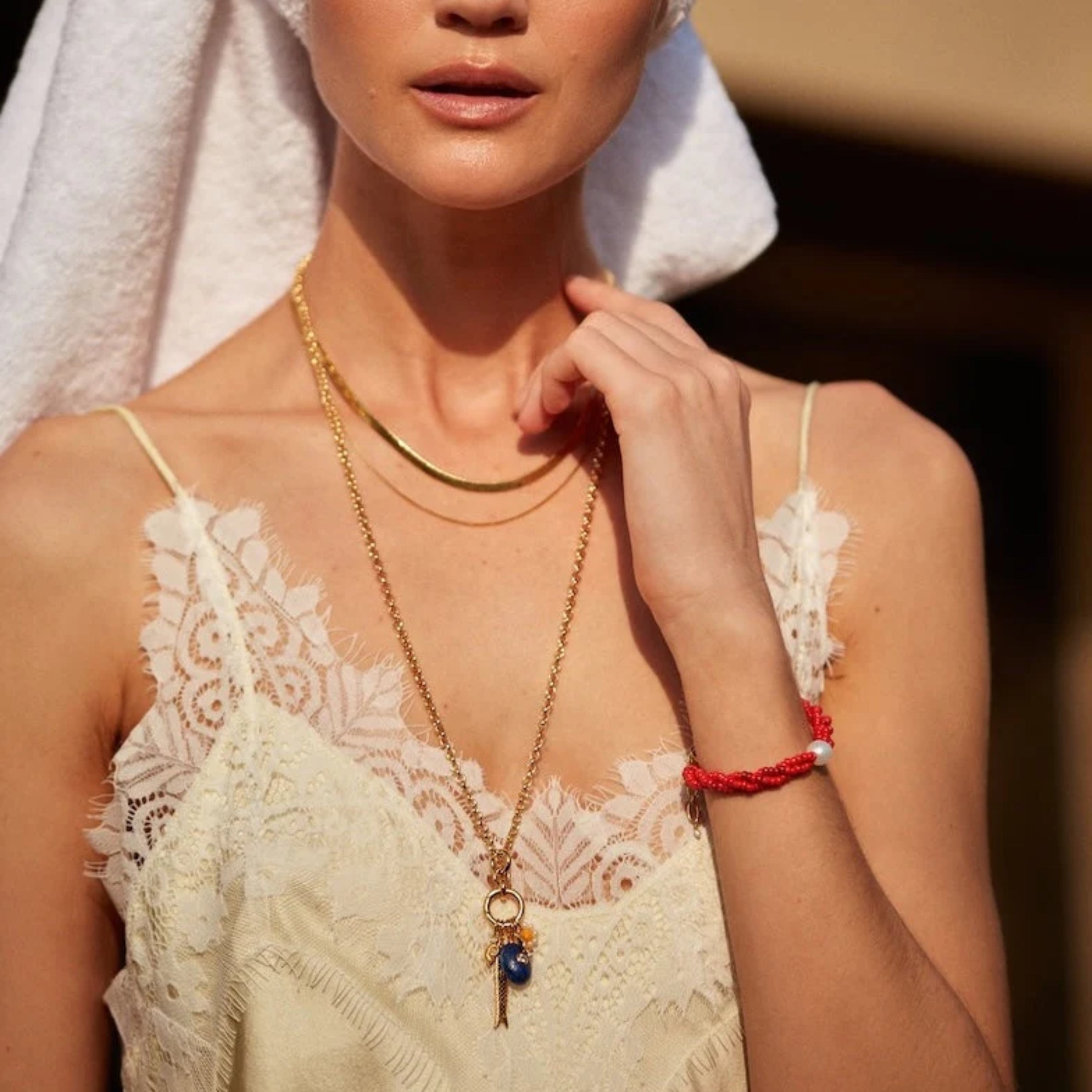 SWIMCLUB is a poolside daydream — pearls, lapis and golden details woven into playful elegance.