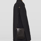 Black ‘Tangle Ring’ shoulder bag from JIL SANDER. Made of calf leather, this item fastens via a zip and showcases a printed logo on the front. It is complete with a braided strap accentuated with metal rings and fringes, gold-tone metal hardware and one internal compartment with a card slot.