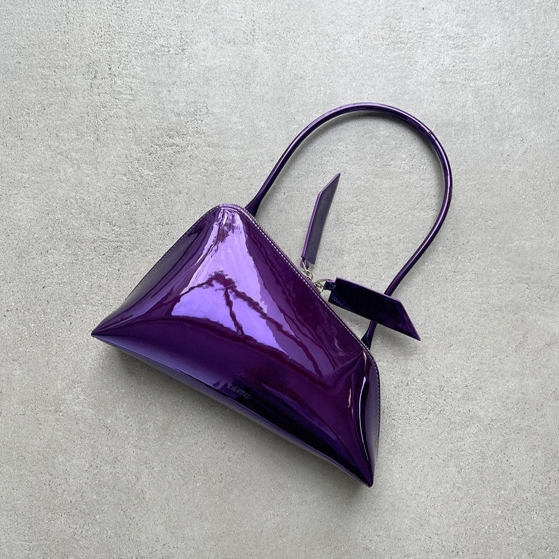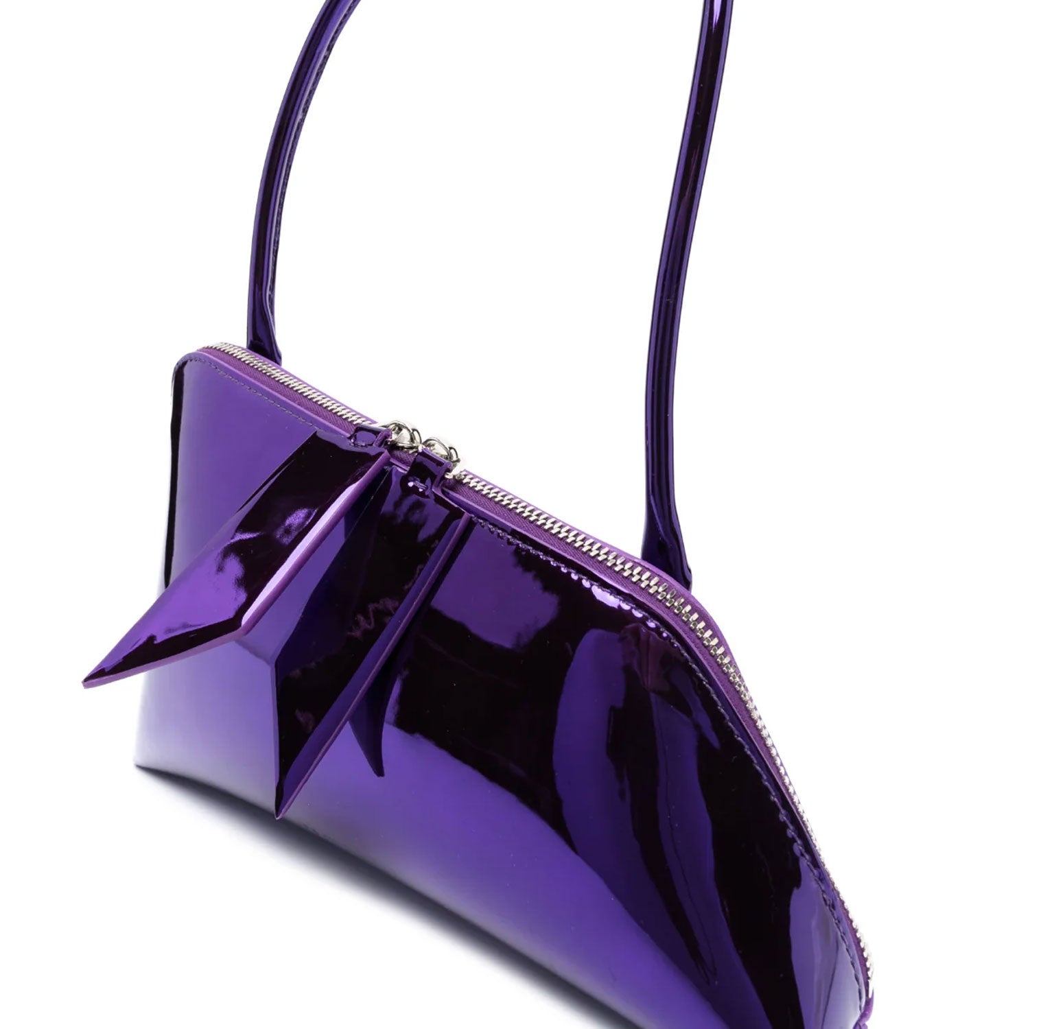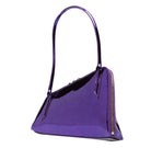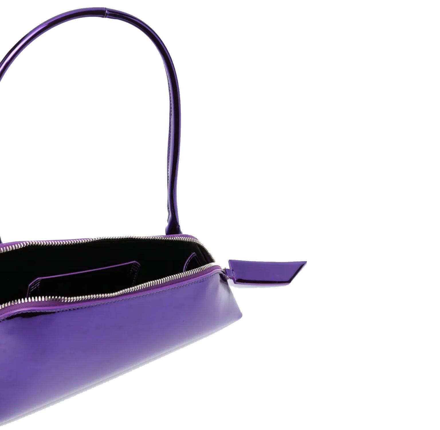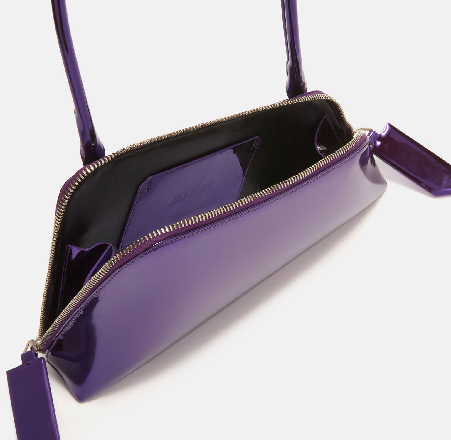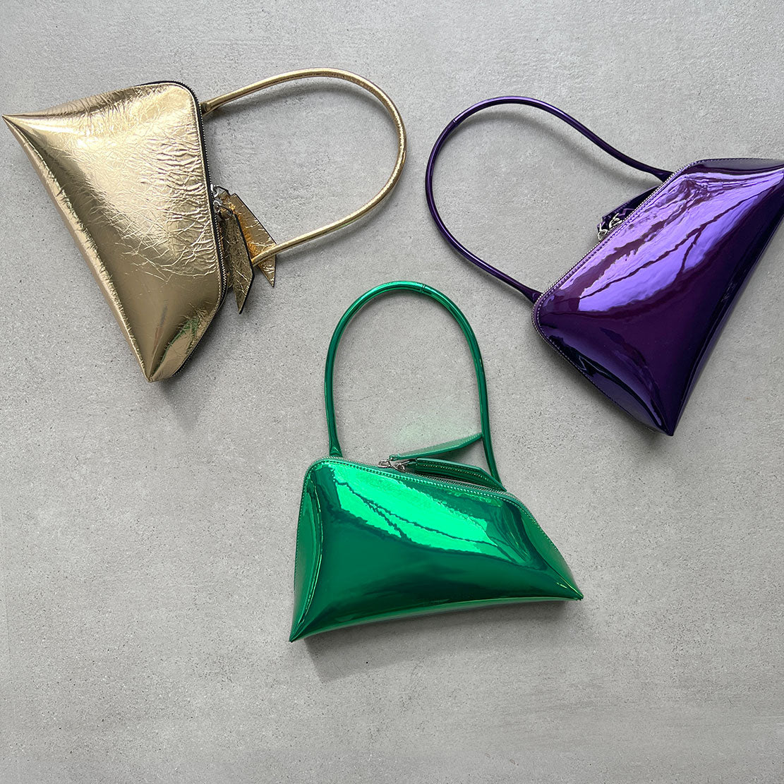 "Sunrise" shoulder bag in emerald laminated material with shoulder strap and ziptop closure.
