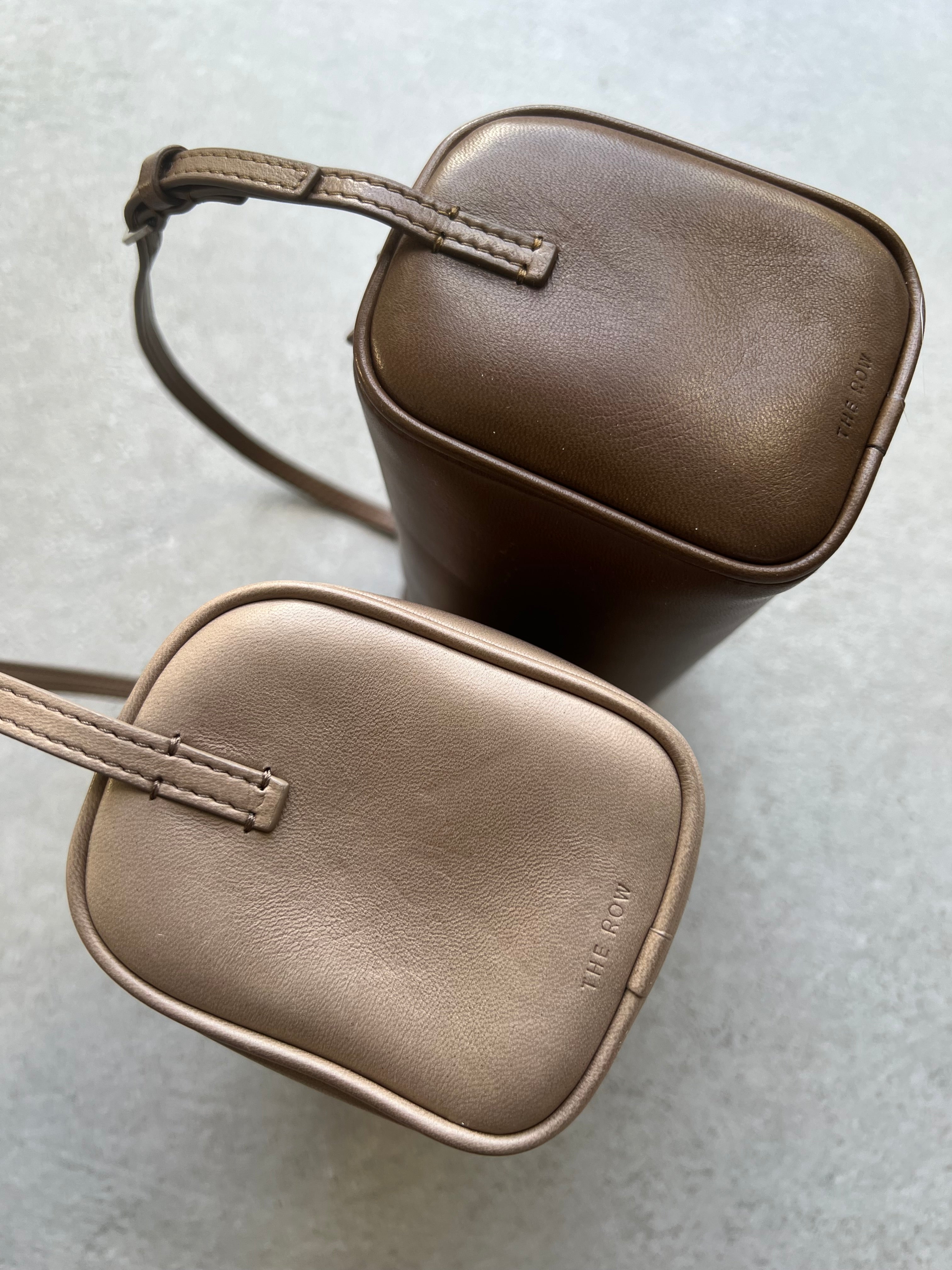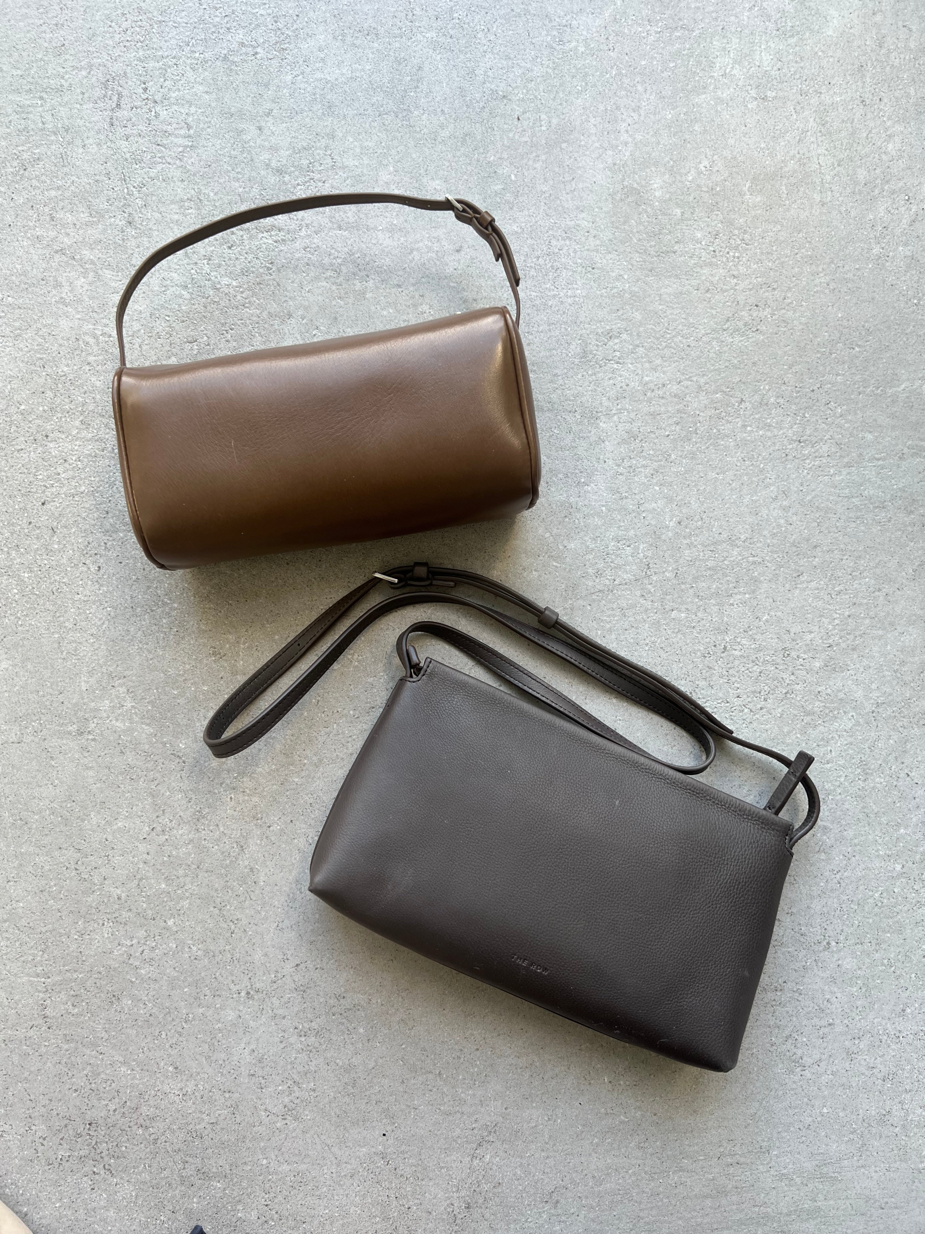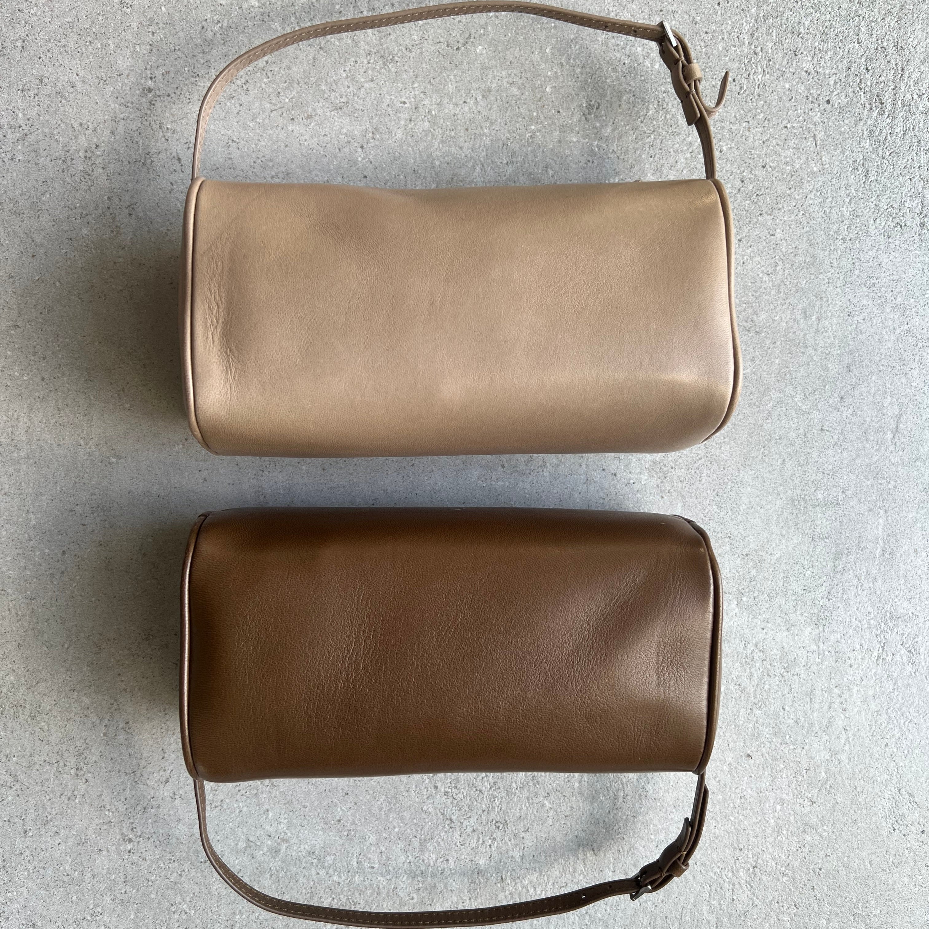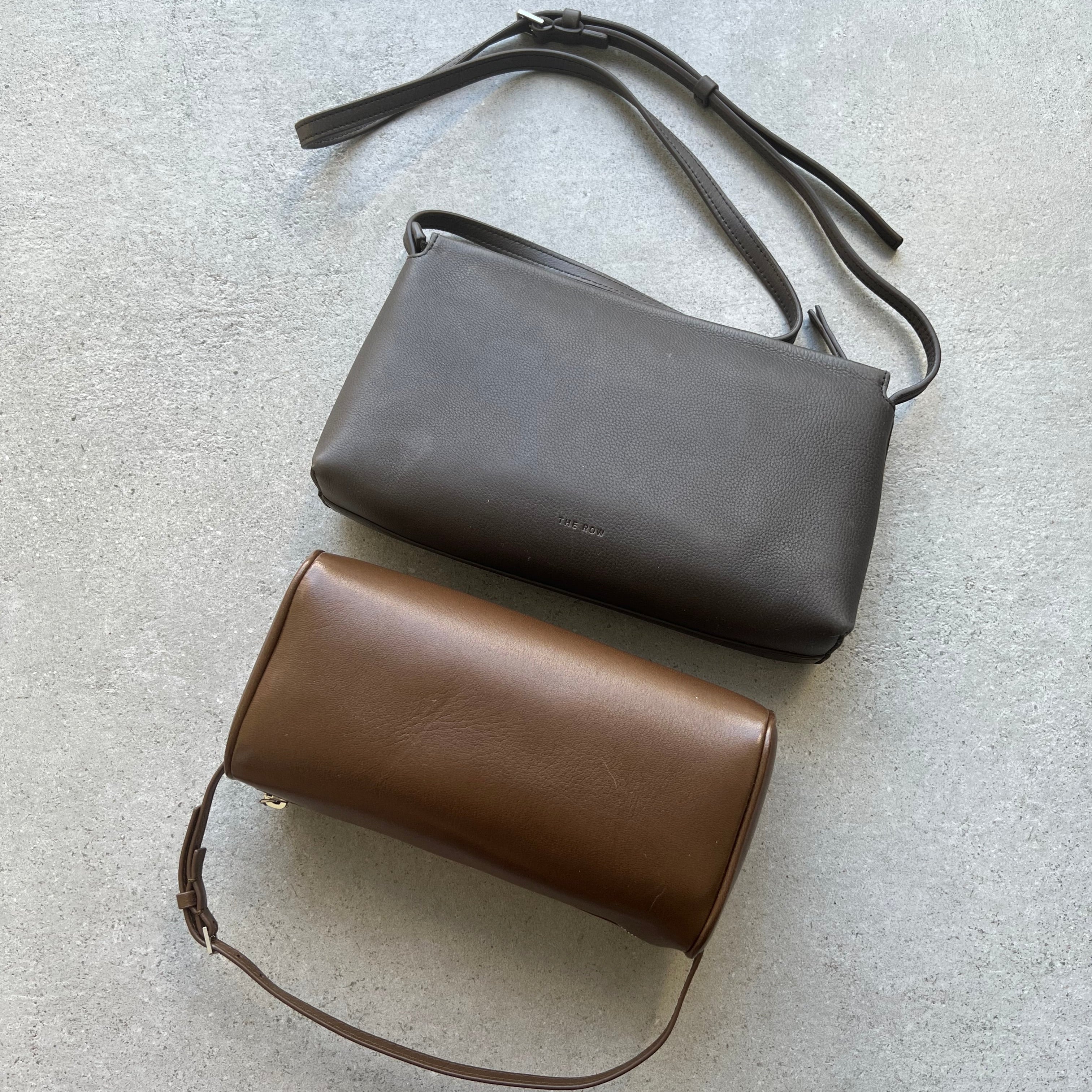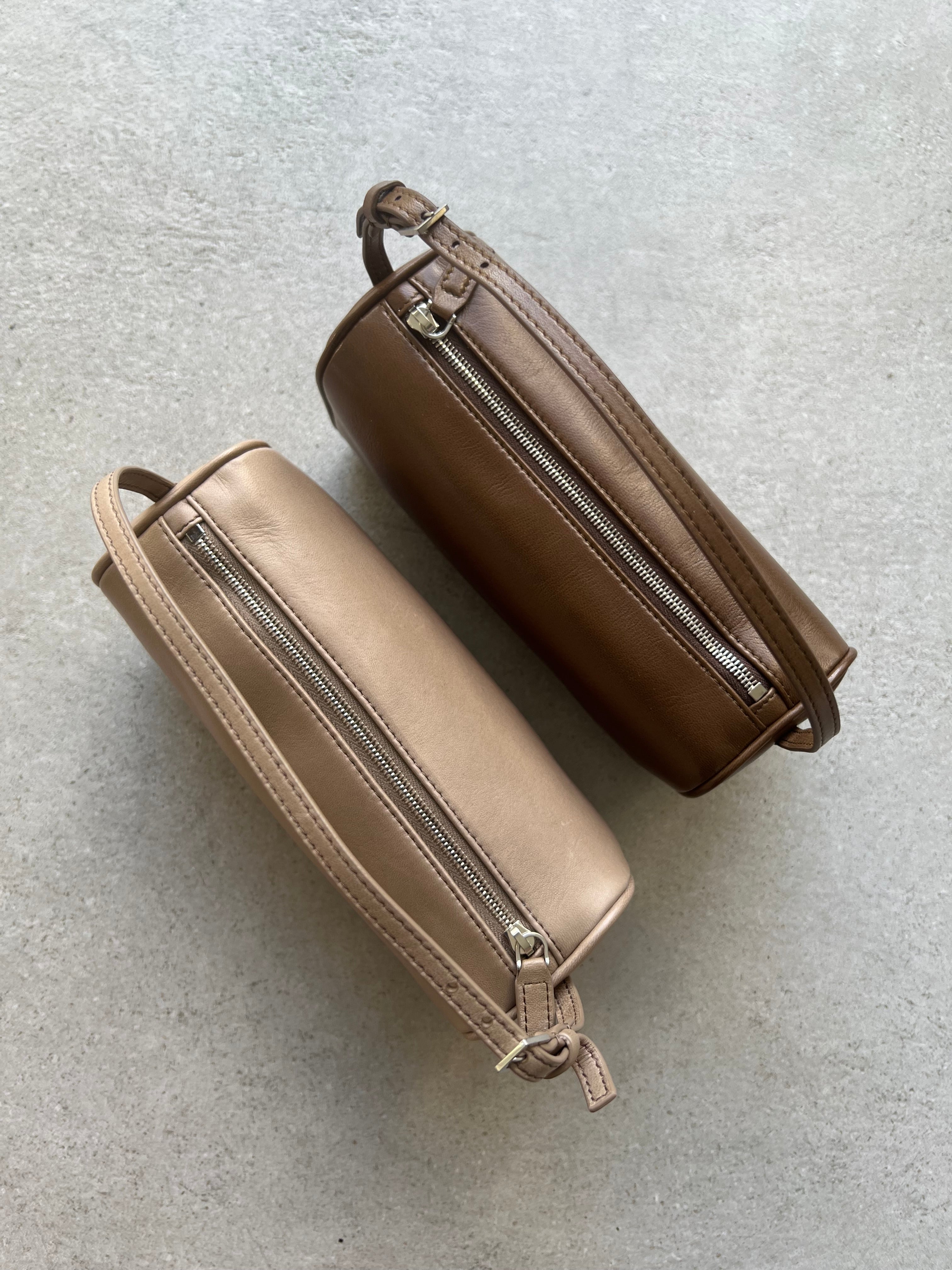 Top handle bag in smooth nappa leather with softly rounded edges, leather piping, and adjustable slim leather strap.