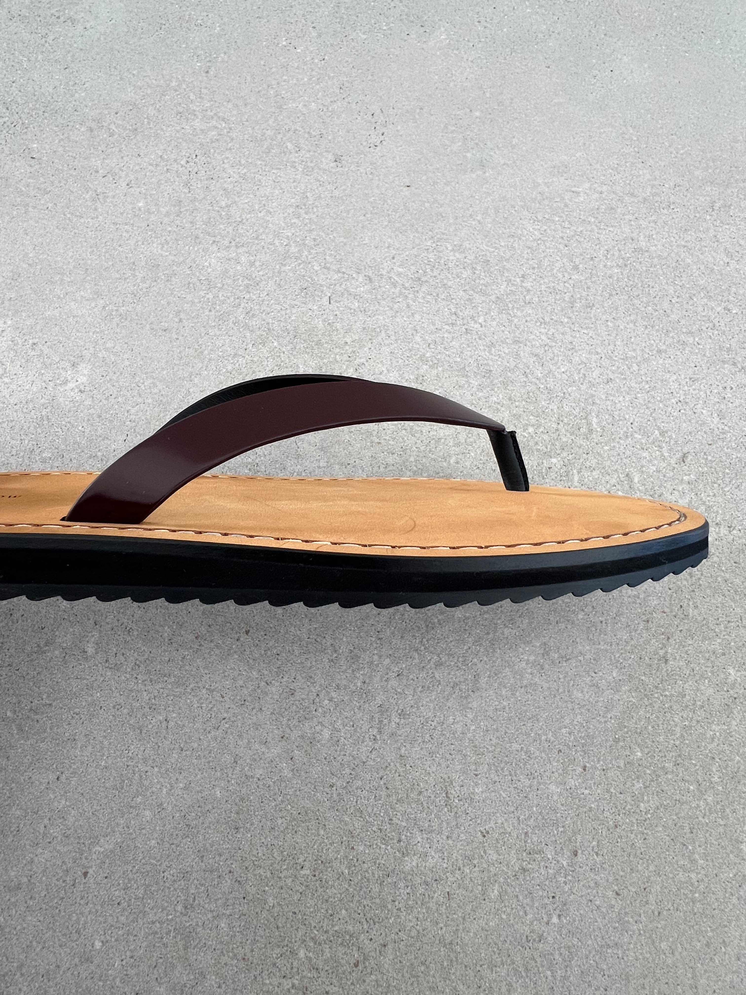 Refined thong sandal crafted from glossy calfskin leather, featuring a contrasting leather footbed and subtle stitched detailing. Finished with a lightly treaded rubber sole, the minimalist silhouette offers understated comfort and effortless everyday wear.