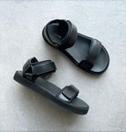 Sport-inspired sandal with neoprene lined smooth nappa leather straps, molded leather footbed and foam midsole for extra comfort. Finished with an adjustable velcro strap at vamp and ankle.