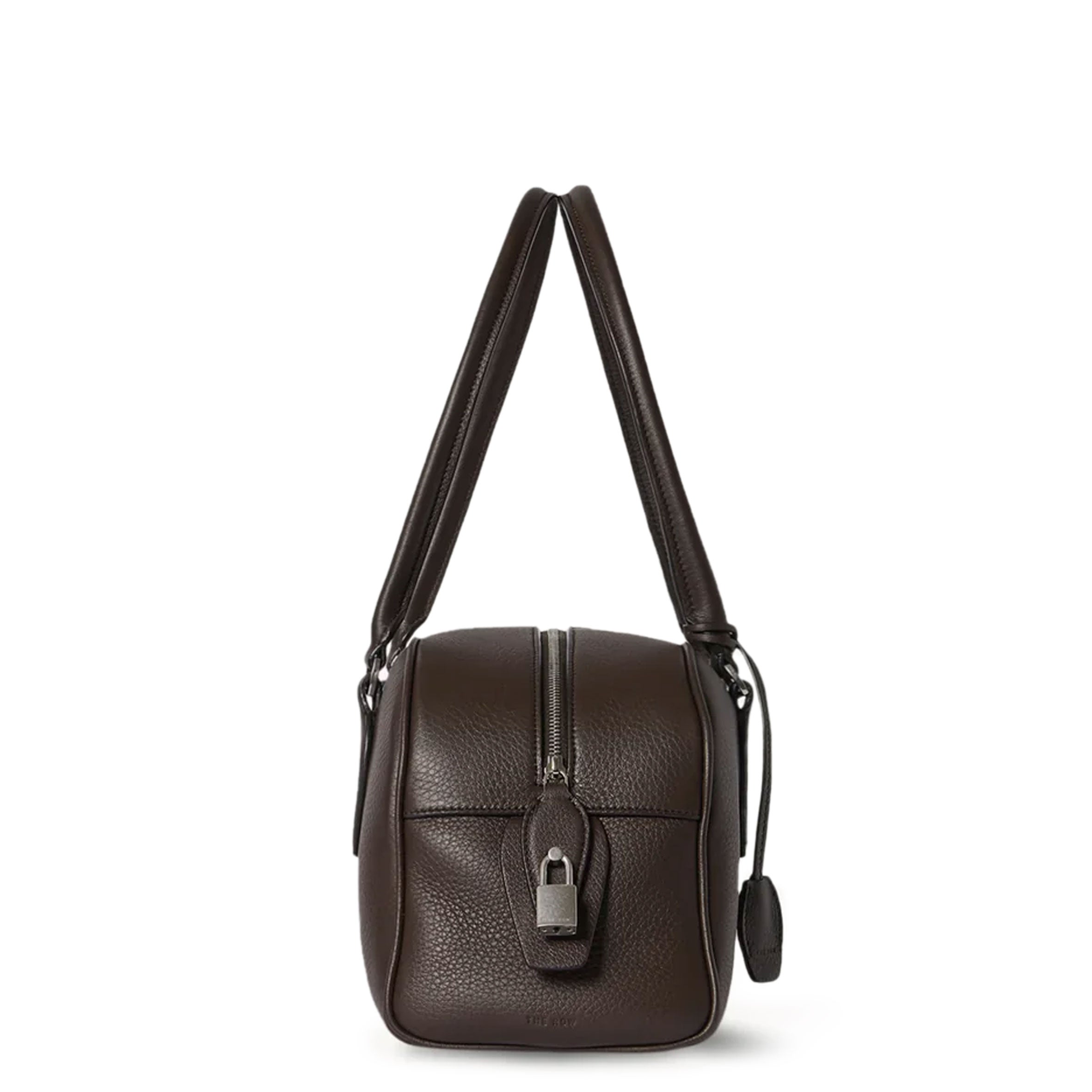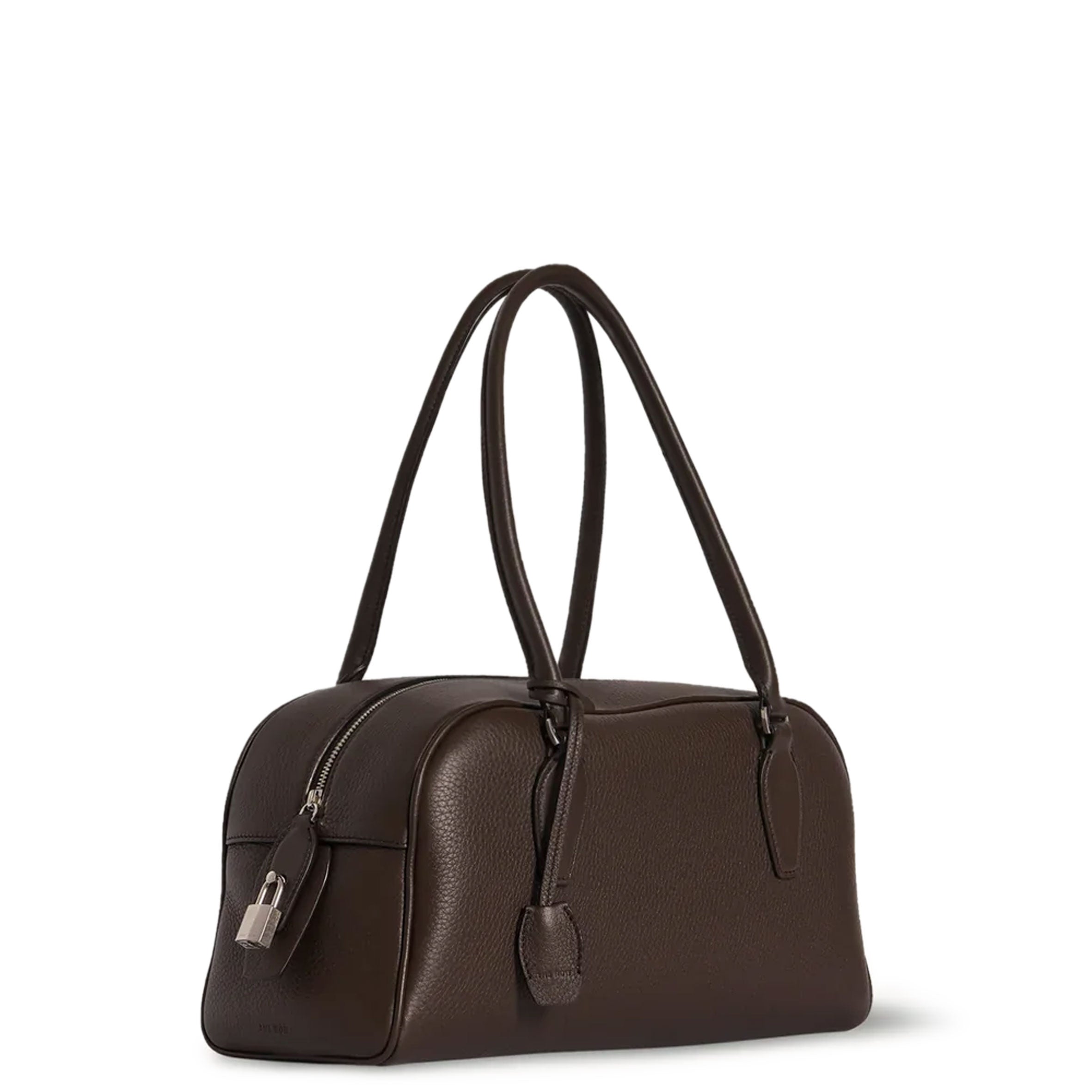 Bowling bag in textured calfskin leather with elongated silhouette, extended tubular handles, piping, branded metal padlock and key, and top zipper closure. Minimally finished, the natural grain surface is left intact, giving the leather a supple hand and refined texture that develops character over time.