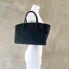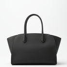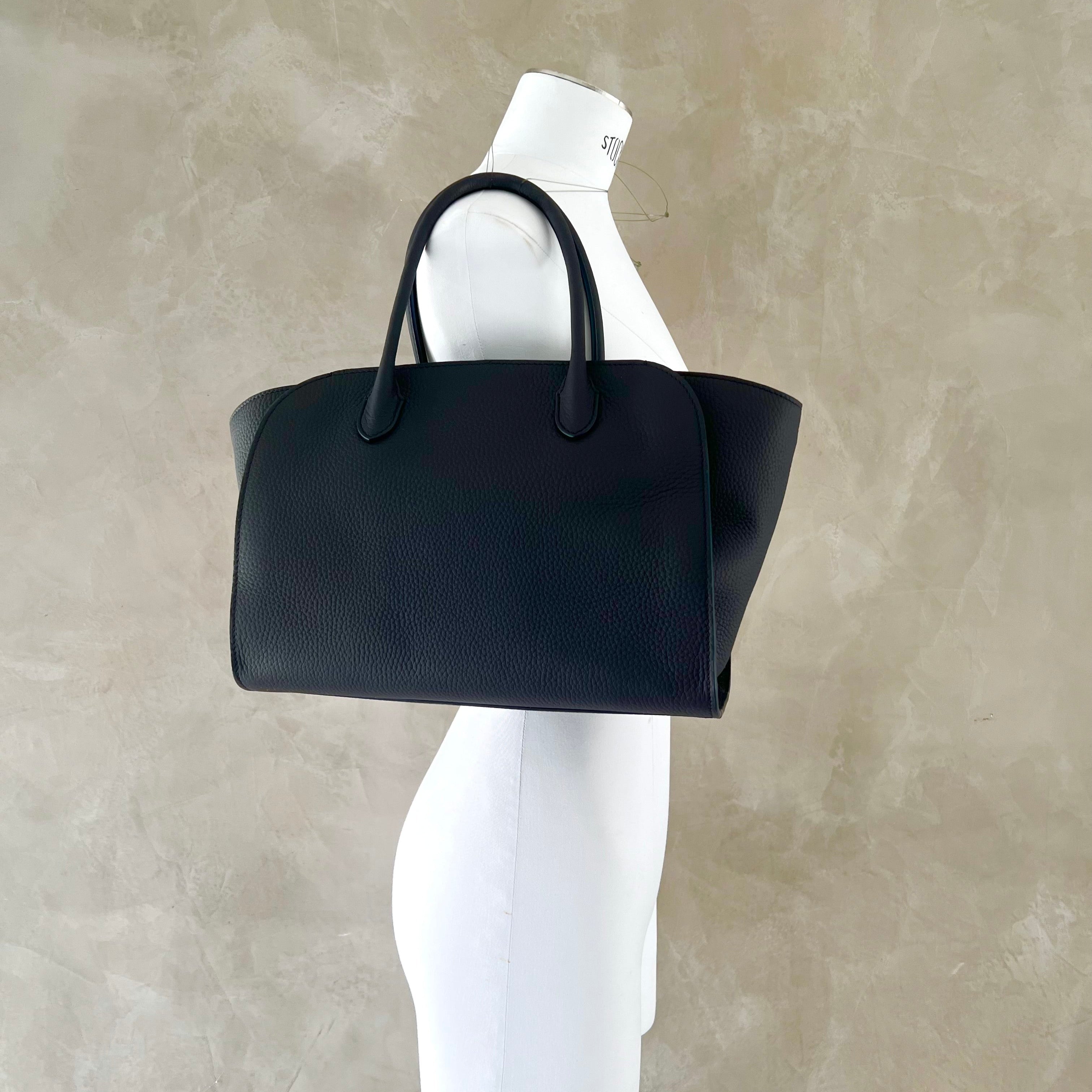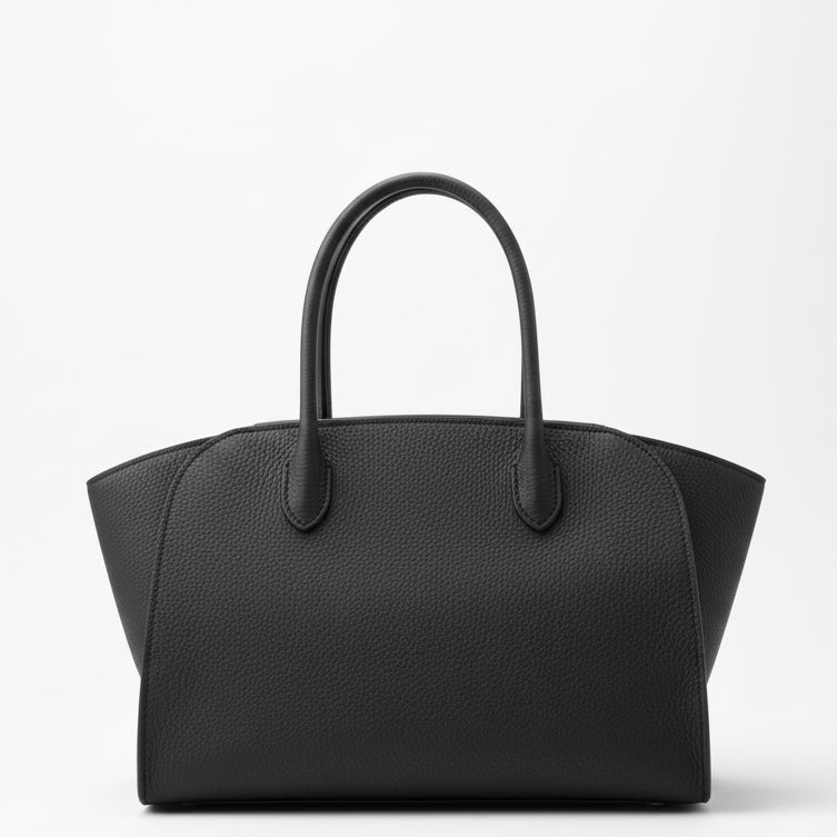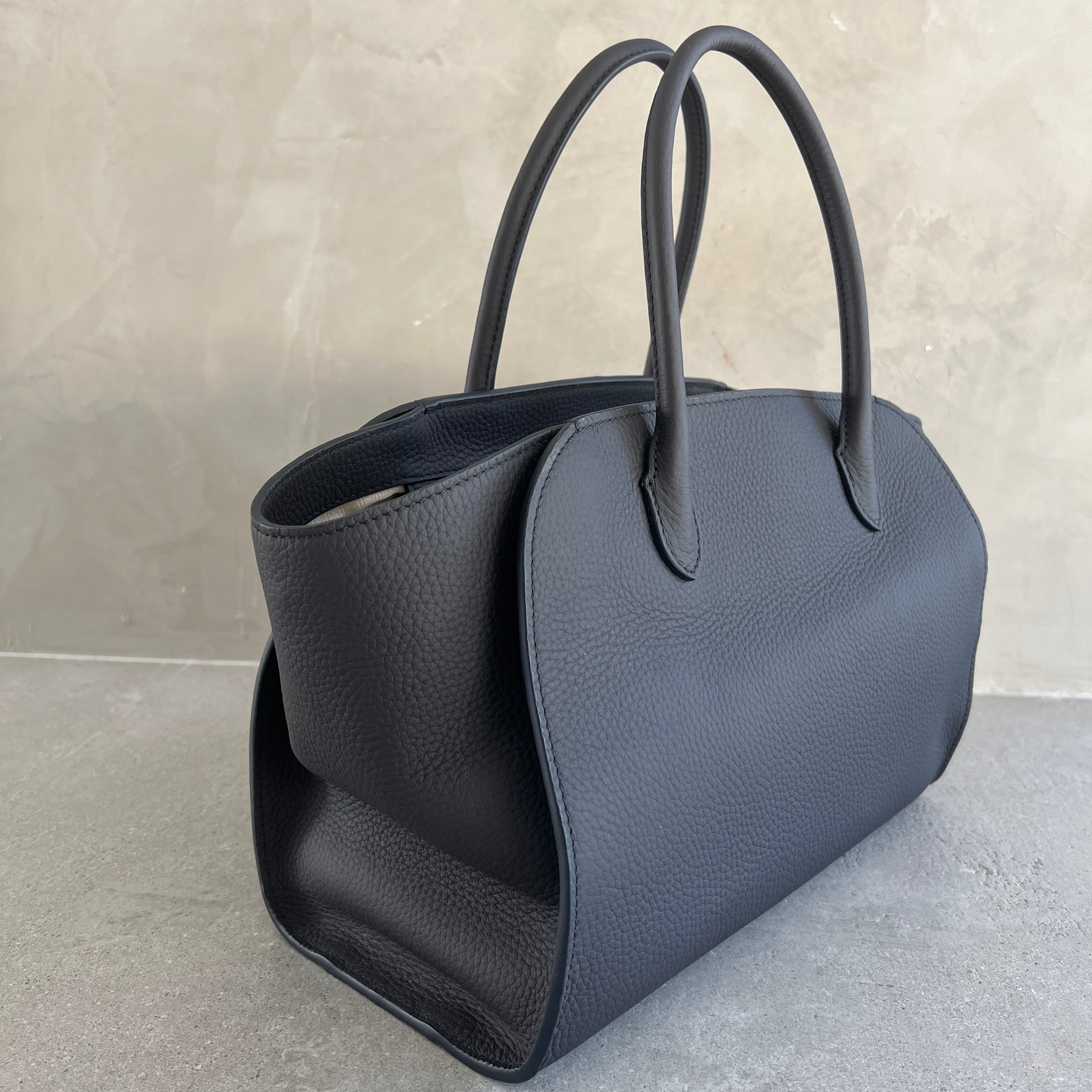 Softly structured tote bag in matte grained calfskin leather with tubular handles, gusseted side panels, and top zipper closure.