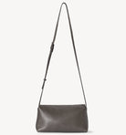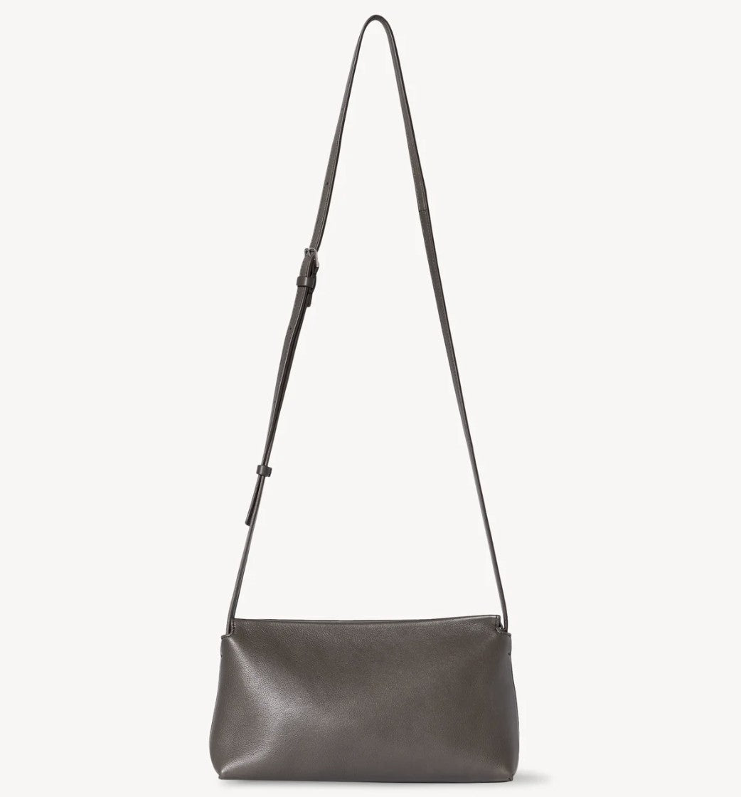 Rectangular crossbody bag in finely grained calfskin leather with adjustable slim leather strap and top zipper closure. Characterized by a buttery-soft hand and subtle sheen, the leather offers a supple texture and refined finish.