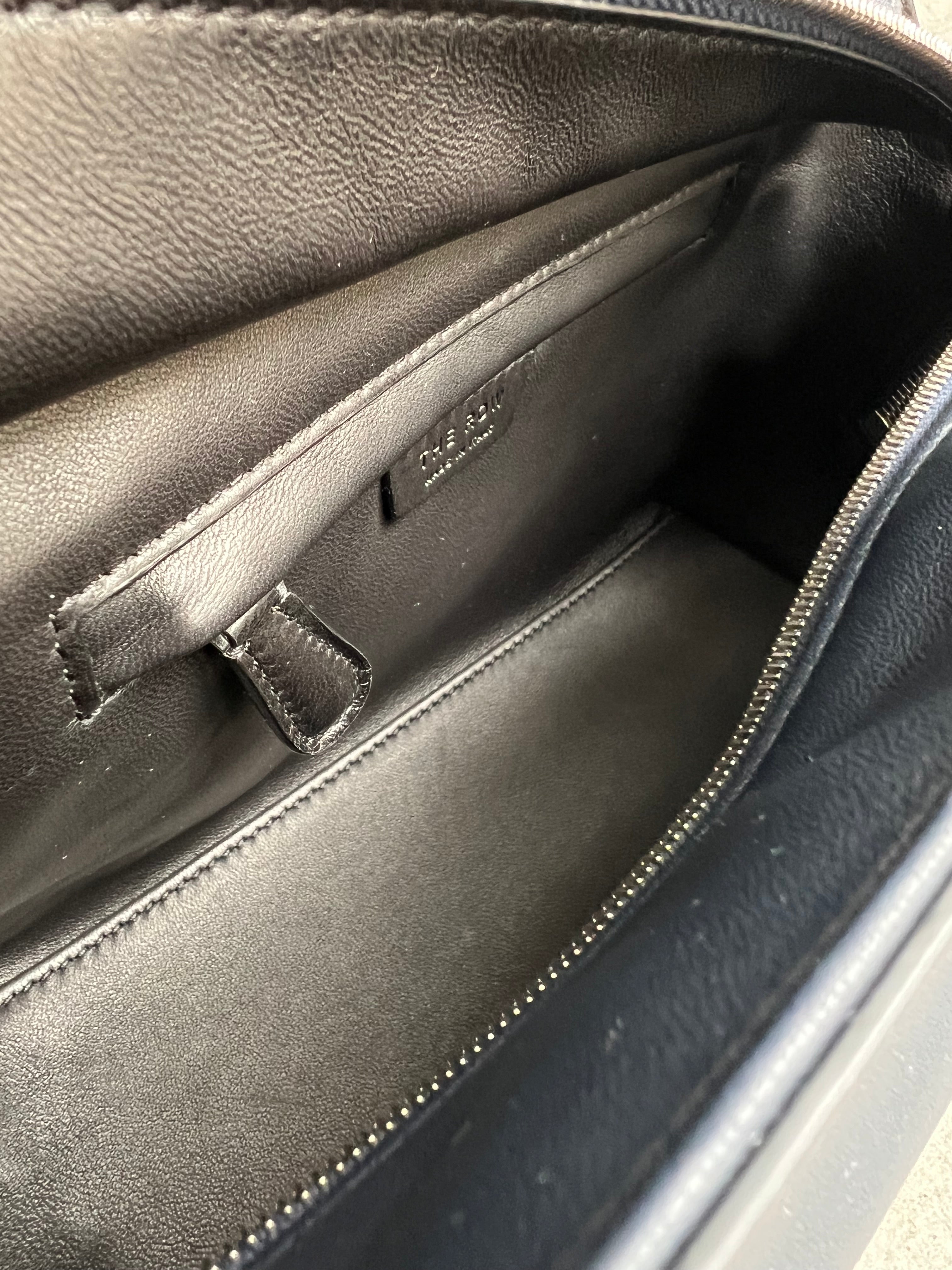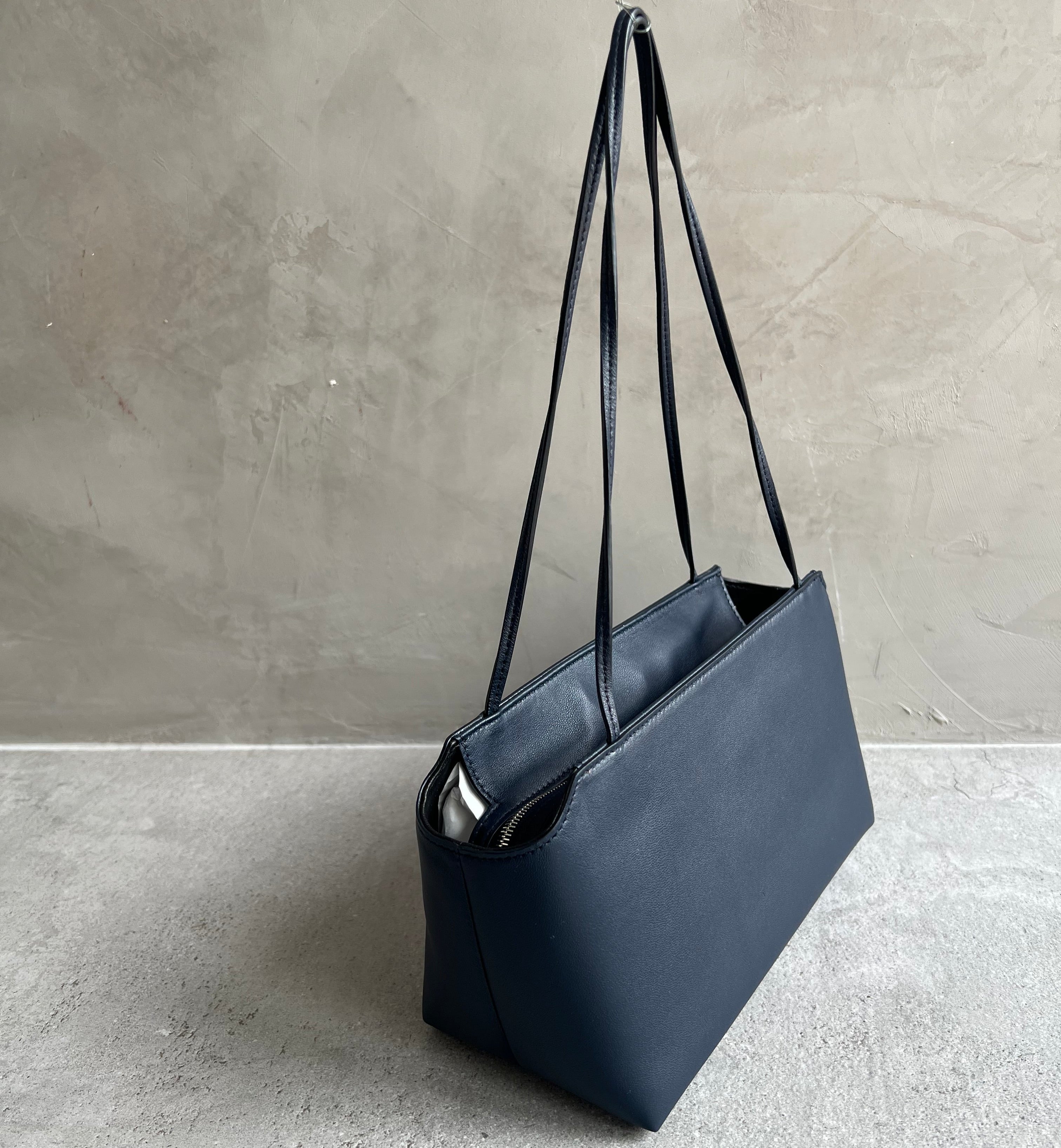 Softly structured shoulder bag in finely grained calfskin leather with slim elongated flat straps, notched top corners, flat base, and internal zip frame closure. This new addition builds on the original Terrasse, offering new proportions and refined details. Minimally finished, the leather retains the natural character of the hide while offering a supple, glove-like hand.