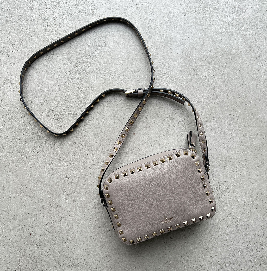 Valentino Garavani Rockstud cross body bag in grained calfskin. Platinum tone studs and metal hardware with a top zip closure. Adjustable studded strap. Interior has an open pocket.